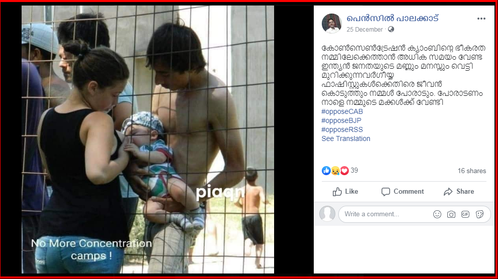 പോസ്റ്റില് നല്കിയ ചിത്രം കോണ്സന്റ്രെഷന് ക്യാമ്പിന്റെതല്ല. ഇന്ത്യയുമായി ഈ ചിത്രത്തിന് യാതൊരു ബന്ധവുമില്ല. തെറ്റിദ്ധരിപ്പിക്കുന്ന തരത്തിലാണ് ഈ ചിത്രം പോസ്റ്റിലൂടെ പ്രചരിപ്പിക്കുന്നത്.