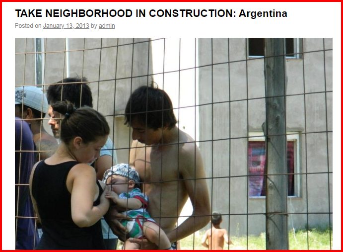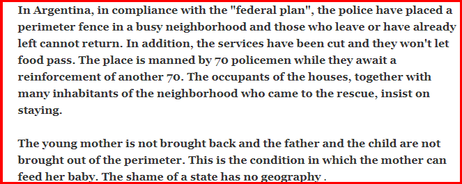 അര്ജന്റിനയില് ഒരു അനധികൃത കോളനിയുടെ ചുറ്റത്തില് സ്റ്റീല് വേലിയുടെ ഒരു കോമ്പൌണ്ട് കെട്ടി. ഇതോട് നഗരത്തിലെ മറ്റേ ആളുകളുമായി ഈ കോളനിയിലെ നിവാസികള് പിരിഞ്ഞു. ഇതില് പെട്ട ഒരു അമ്മയുടെ അവസ്ഥയാണ് നമ്മള് ചിത്രത്തില് കാണുന്നത്. ഈ സ്ത്രി ഈ ഇരുമ്പ് അഴിയുടെ ഒരു ഭാഗത്ത് പെട്ടുപോയി. ഭര്ത്താവും കുഞ്ഞും അഴിയുടെ മറു ഭാഗത്തും. കുട്ടിയെ മുലപ്പാല് കുടിപ്പിക്കാനായി ഭര്ത്താവ് കുഞ്ഞിനെ കൊണ്ട് അഴിയുടെ അടുത്ത് പോയി. കുട്ടിയുടെ അമ്മ അഴിയുടെ ഇടയില് നിന്ന് സ്ത്രി കുഞ്ഞിനെ പാല് കുടിപ്പിച്ചു. ഈ ദൃശ്യമാണ് നാം ചിത്രത്തില് കാണുന്നത്. ഇത് കോണ്സന്റ്രെഷന് ക്യാമ്പ് അല്ല. ബ്ലോഗില് ഈ ക്യാമ്പിന്റെ ദൃശ്യങ്ങളും ലഭ്യമാണ്.