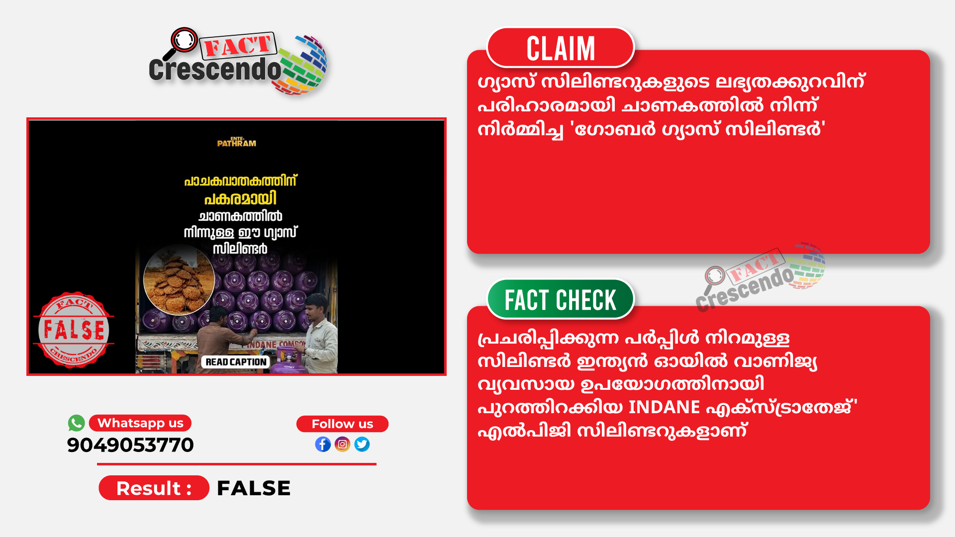 ഗ്യാസ് സിലിണ്ടറുകളുടെ വിലക്കയറ്റത്തിന് പരിഹാരമായി ചാണകത്തിൽ നിന്ന് നിർമ്മിച്ച ‘ഗോബർ ഗ്യാസ് സിലിണ്ടർ’ എന്ന് പ്രചരിപ്പിക്കുന്ന പര്പ്പിള് നിറമുള്ള സിലിണ്ടര് ഇന്ത്യൻ ഓയിൽ വാണിജ്യ വ്യവസായ ഉപയോഗത്തിനായി പുറത്തിറക്കിയ ‘ INDANE എക്സ്ട്രാതേജ്’ എൽപിജി സിലിണ്ടറുകളാണ്.