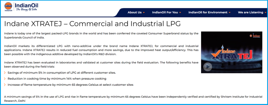 വാണിജ്യ, വ്യാവസായിക ആവശ്യങ്ങൾക്കായി ഇൻഡ്യൻ ഓയിൽ നാനോ-അഡിറ്റീവ് അടങ്ങുന്ന എൽപിജി- ‘INDANE എക്സ്ട്രാതേജ്’ എന്ന പേരിൽ വിപണനം ചെയ്യുന്നുണ്ട് എന്നാണ് കമ്പനി വെബ്സൈറ്റിൽ നൽകിയിരിക്കുന്നത്.