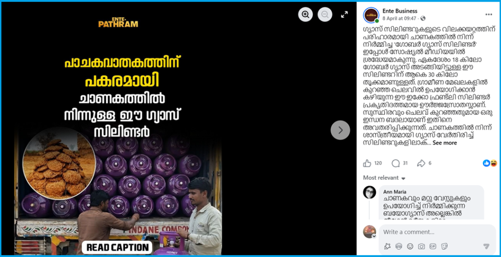 എന്നാല് തെറ്റിദ്ധരിപ്പിക്കുന്ന പ്രചാരണമാണ് ഇതെന്നും ചാണകത്തില് നിന്നുള്ള ബയോഗ്യാസ് വിപണിയിലെത്തിയിട്ടില്ലെന്നും അന്വേഷണത്തില് ഞങ്ങള് കണ്ടെത്തി.