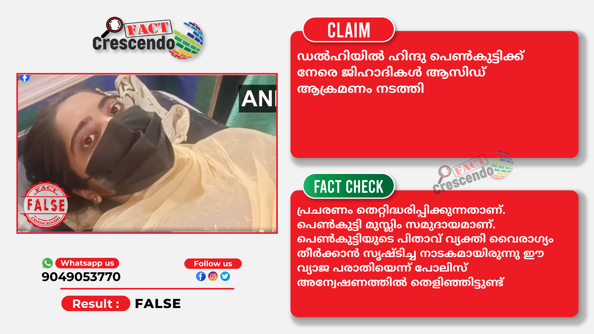 ഡൽഹിയിൽ ഹിന്ദു പെൺകുട്ടിക്ക് നേരെ ജിഹാദികൾ ആസിഡ് ആക്രമണം നടത്തിയെന്ന പ്രചരണം തെറ്റിദ്ധരിപ്പിക്കുന്നതാണ്. പെണ്കുട്ടി മുസ്ലിം സമുദായമാണ്. പെണ്കുട്ടിയുടെ പിതാവ് വ്യക്തി വൈരാഗ്യം തീര്ക്കാന് സൃഷ്ടിച്ച നാടകമായിരുന്നു ഈ വ്യാജ പരാതിയെന്ന് പോലിസ് അന്വേഷണത്തില് തെളിഞ്ഞിട്ടുണ്ട്.