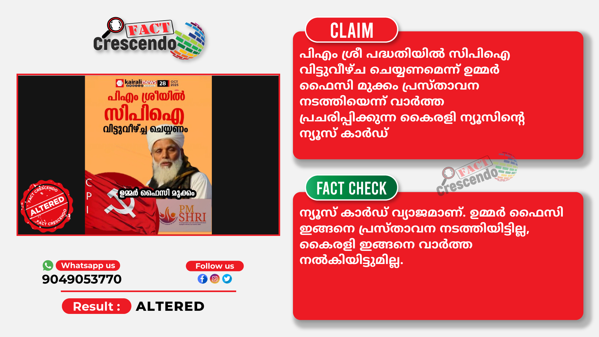 Title:പിഎം ശ്രീ വിഷയത്തില് സിപിഐ വിട്ടുവീഴ്ച ചെയ്യണമെന്ന് മുക്കം ഫൈസി- പ്രചരിക്കുന്ന ന്യൂസ് കാര്ഡ് വ്യാജം…