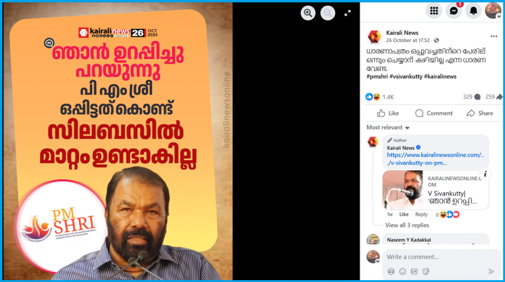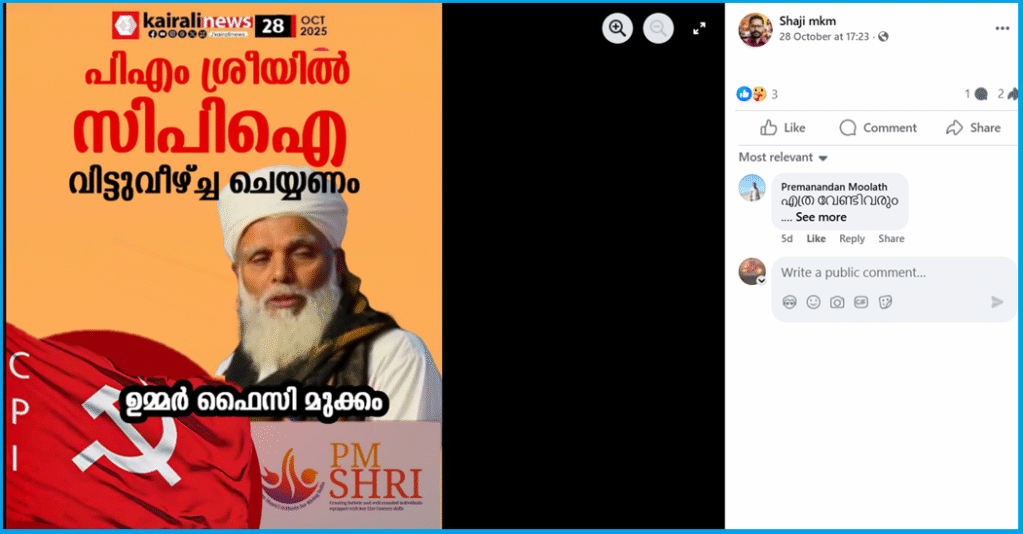 പിഎം ശ്രീ വിദ്യാഭ്യാസ പദ്ധതിയില് സിപിഐ നേതാക്കള് പരസ്യമായി കടുത്ത വിമര്ശനം ഉന്നയിച്ചു എന്ന് റിപ്പോര്ട്ടുകളുണ്ട്. എന്നാല് മത നേതാവായ ഉമ്മര് ഫൈസിയുടെ പ്രതികരണവുമായി ബന്ധപ്പെട്ട മാധ്യമവാര്ത്തകള് തിരഞ്ഞെങ്കിലും ഈ വിഷയത്തില് അദ്ദേഹം എന്തെങ്കിലും പ്രതികരണം നടത്തിയതായി ഒന്നും കണ്ടെത്താനായില്ല.