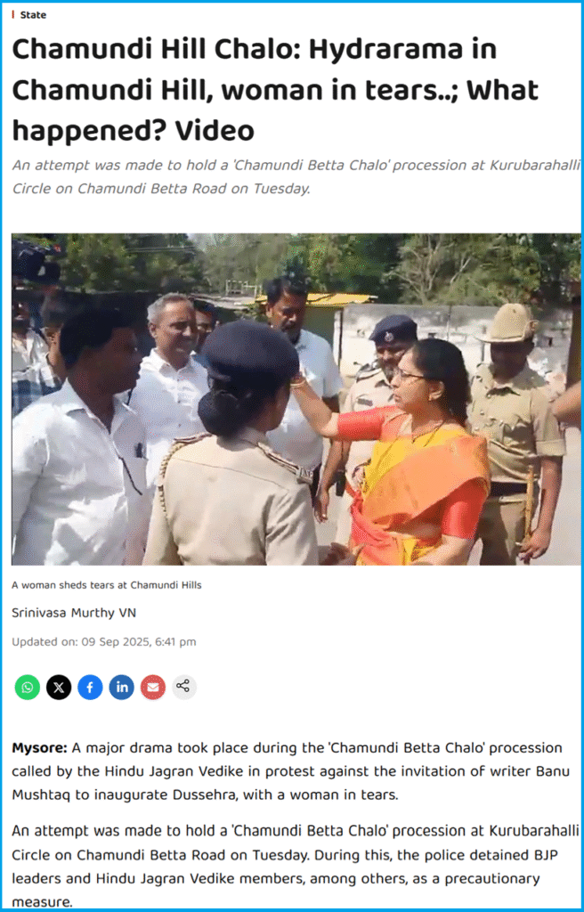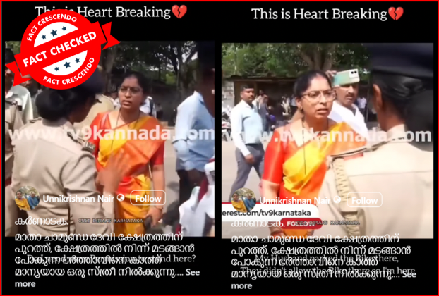 ഞങ്ങള്‍ വീഡിയോ കീഫ്രെയ്മുകളുടെ റിവേഴ്‌സ് ഇമേജ് അന്വേഷണം  നടത്തി നോക്കിയപ്പോള്‍ സമാന ദൃശ്യങ്ങള്‍ 2025 സെപ്റ്റംബര്‍ 9ന് കന്നഡപ്രഭ ഫേസ്ബുക്ക് പേജില്‍ നിന്നും ലഭിച്ചു. ചാമുണ്ഡി ദേവീ ക്ഷേത്രത്തില്‍ ദര്‍ശനത്തിനെത്തിയ ഭക്തയെ അവിടെ പ്രതിഷേധിക്കാനെത്തിയ ഹിന്ദു സംഘടനയുടെ പ്രവര്‍ത്തകയാണെന്ന് തെറ്റിദ്ധരിച്ച് പൊലീസ് തടഞ്ഞുവച്ചുവെന്നാണ് ഒപ്പമുള്ള വിവരണം. ഇതു സംബന്ധിച്ച് വിശദമായ റിപ്പോര്‍ട്ട് കന്നഡപ്രഭ ഓണ്‍ലൈന്‍ പതിപ്പിലുണ്ട്.