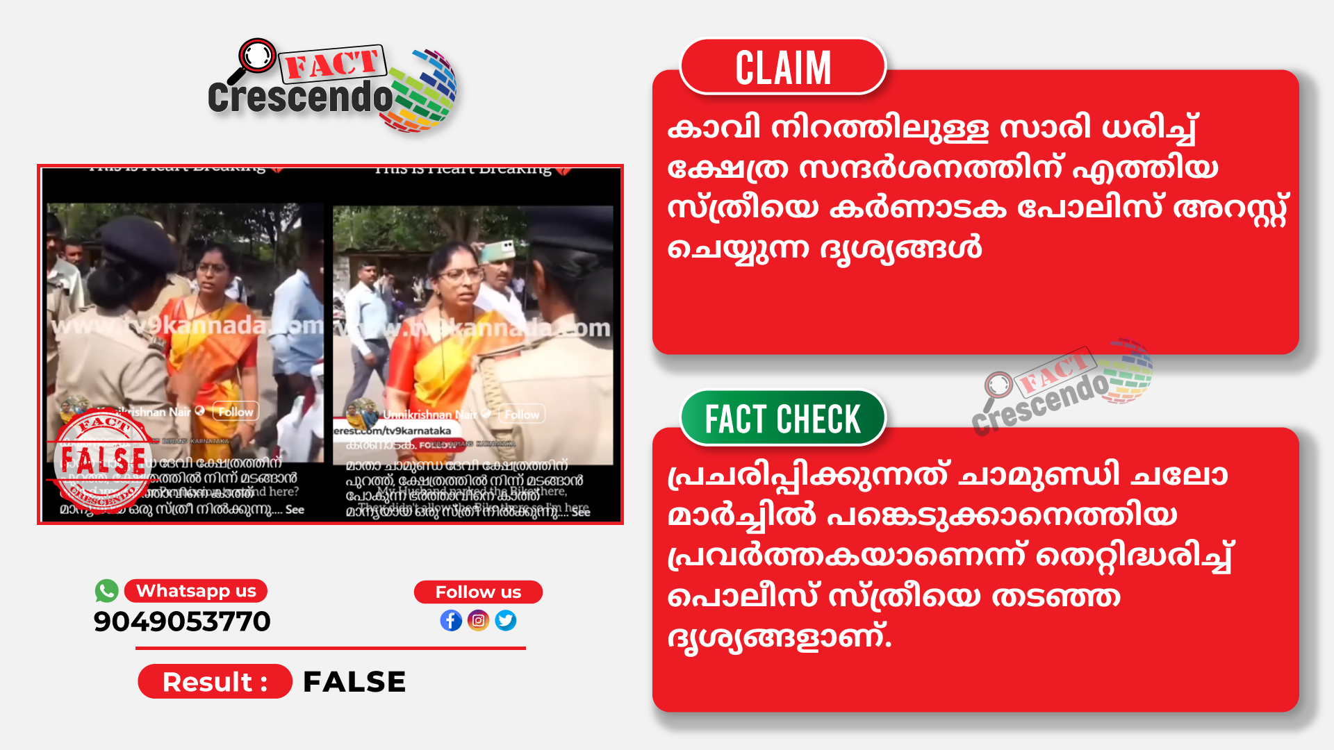 കാവി നിറത്തിലുള്ള സാരി ധരിച്ച് ക്ഷേത്ര സന്ദര്‍ശനത്തിന് എത്തിയ സ്ത്രീയെ കര്‍ണാടക പോലിസ് അറസ്റ്റ് ചെയ്യുന്ന ദൃശ്യങ്ങള്‍ എന്ന് പ്രചരിപ്പിക്കുന്നത് ചാമുണ്ഡി ചലോ മാര്‍ച്ചില്‍ പങ്കെടുക്കാനെത്തിയ പ്രവര്‍ത്തകയാണെന്ന് തെറ്റിദ്ധരിച്ച് പൊലീസ് സ്ത്രീയെ തടഞ്ഞ ദൃശ്യങ്ങളാണ്.
