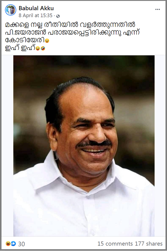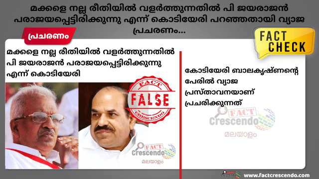 “മക്കളെ നല്ല രീതിയിൽ വളർത്തുന്നതിൽ പി.ജയരാജൻ പരാജയപ്പെട്ടിരിക്കുന്നു എന്ന് കോടിയേരി😌” എന്ന് അദ്ദേഹം പറഞ്ഞതായി പോസ്റ്റിൽ നൽകിയിരിക്കുന്നു കൊടിയേരി ബാലകൃഷ്ണന്റെ ചിത്രവും പോസ്റ്റിലുണ്ട്. ഫാക്റ്റ് ക്രെസണ്ടോ ഈ പ്രചരണത്തെ കുറിച്ച് അന്വേഷിച്ചു ഇത് വെറും വ്യാജപ്രചരണം മാത്രമാണെന്ന് കണ്ടെത്തുകയും ചെയ്തു