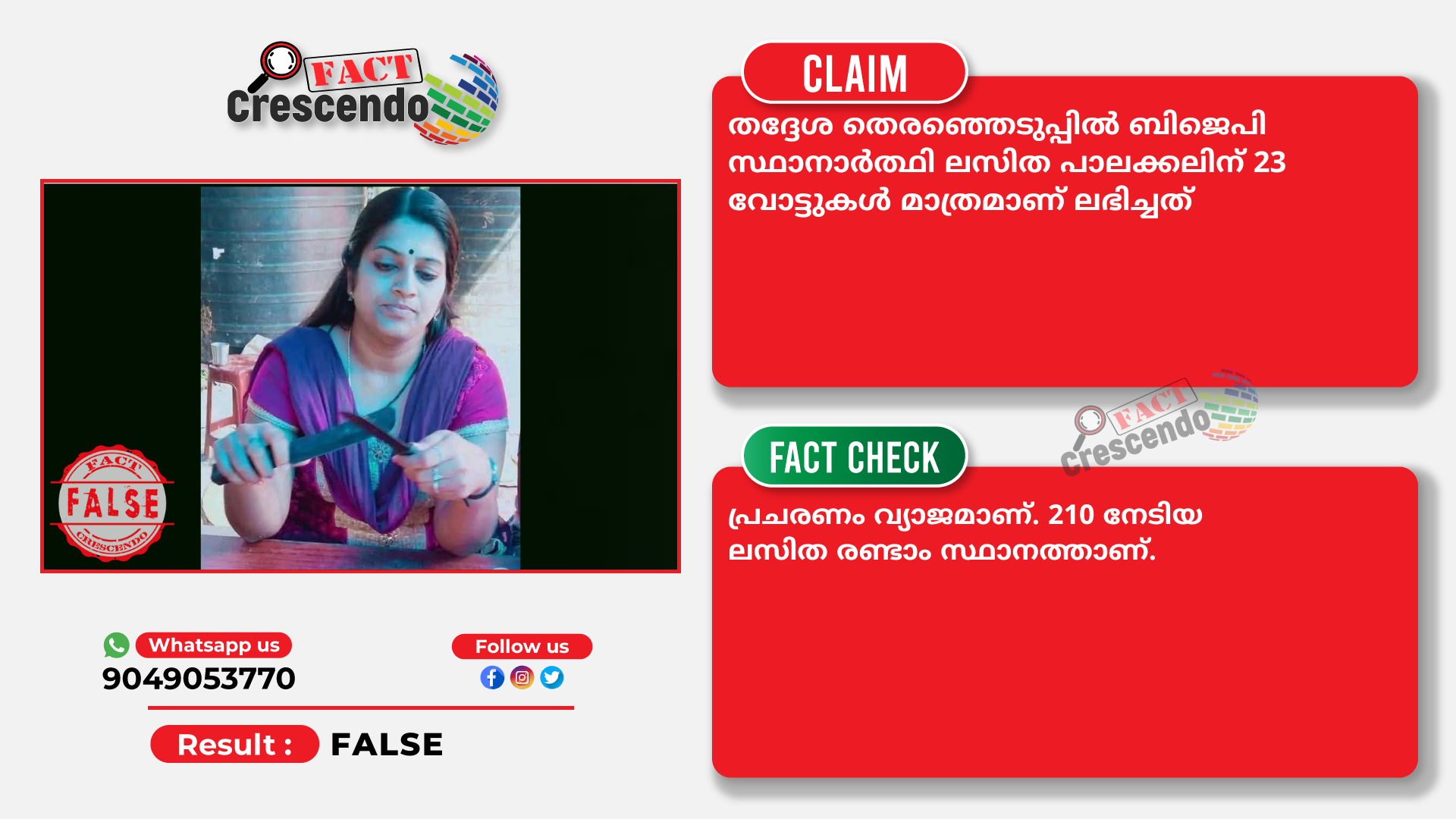 തദ്ദേശ തെരഞ്ഞെടുപ്പിൽ ബിജെപി സ്ഥാനാർത്ഥി ലസിത പാലക്കലിന് 23 വോട്ടുകൾ മാത്രമാണ് ലഭിച്ചത് എന്ന പ്രചരണം വ്യാജമാണ്. 210 നേടിയ ലസിത രണ്ടാം സ്ഥാനത്താണ്.