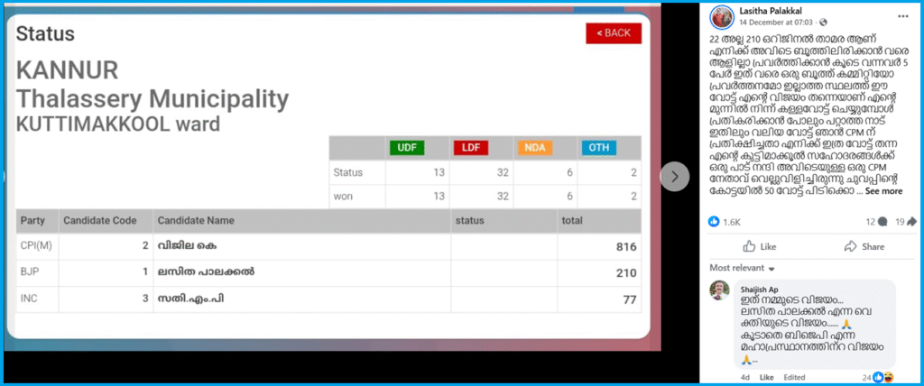 തദ്ദേശ തെരഞ്ഞെടുപ്പ് ഫലം പുറത്ത് വന്നപ്പോള് യുഡിഎഫിന് മുന്നേറ്റമുണ്ടായി. അതുപോലെ ബിജെപിക്കും പലയിടത്തും കൂടുതല് സീറ്റുകളും വോട്ടു വിഹിതവും ലഭിച്ചു. എല്ഡിഎഫിന് പുതിയ സീറ്റുകള് നേടാനായെങ്കിലും സിറ്റിംഗ് സീറ്റുകള് നഷ്ടമാവുകയുമുണ്ടായി. തലശ്ശേരി നഗരസഭയിൽ മത്സരിച്ച ബിജെപി സ്ഥാനാർത്ഥി ലസിത പാലക്കലിന് വെറും 23 വോട്ടുകൾ മാത്രമേ നേടായുള്ളു എന്ന തരത്തിൽ ഒരു പോസ്റ്റ് പ്രചരിക്കുന്നുണ്ട്.