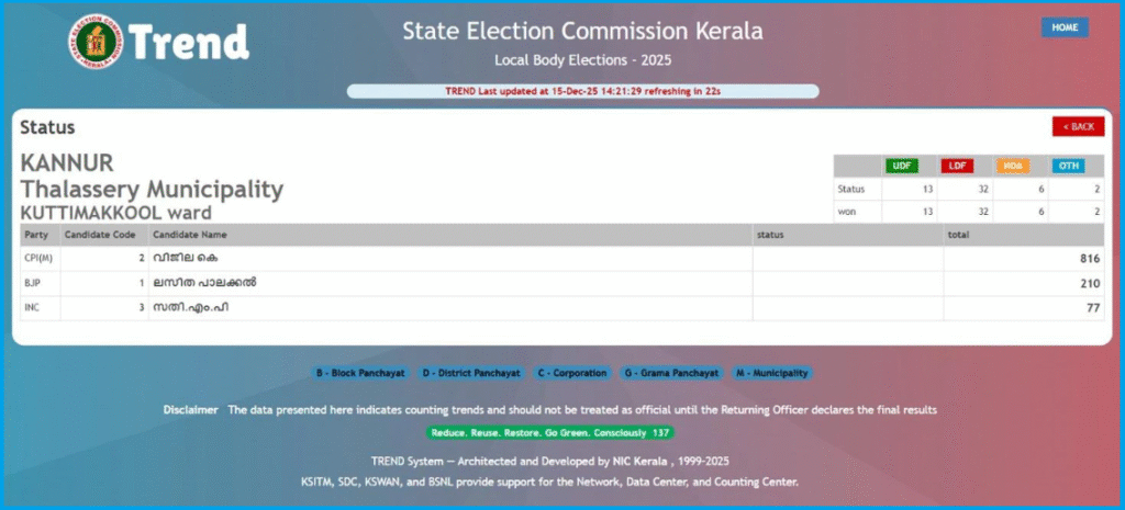 ഈ വാർഡിൽ 816 വോട്ടുകൾ നേടിയ സിപിഎം സ്ഥാനാർത്ഥി കെ വിജിലയാണ് വിജയി. മൂന്നാം സ്ഥാനത്ത് 77 വോട്ടുകൾ മാത്രം നേടിയ കോൺഗ്രസ് സ്ഥാനാർത്ഥി സതി എംപിയാണ്.