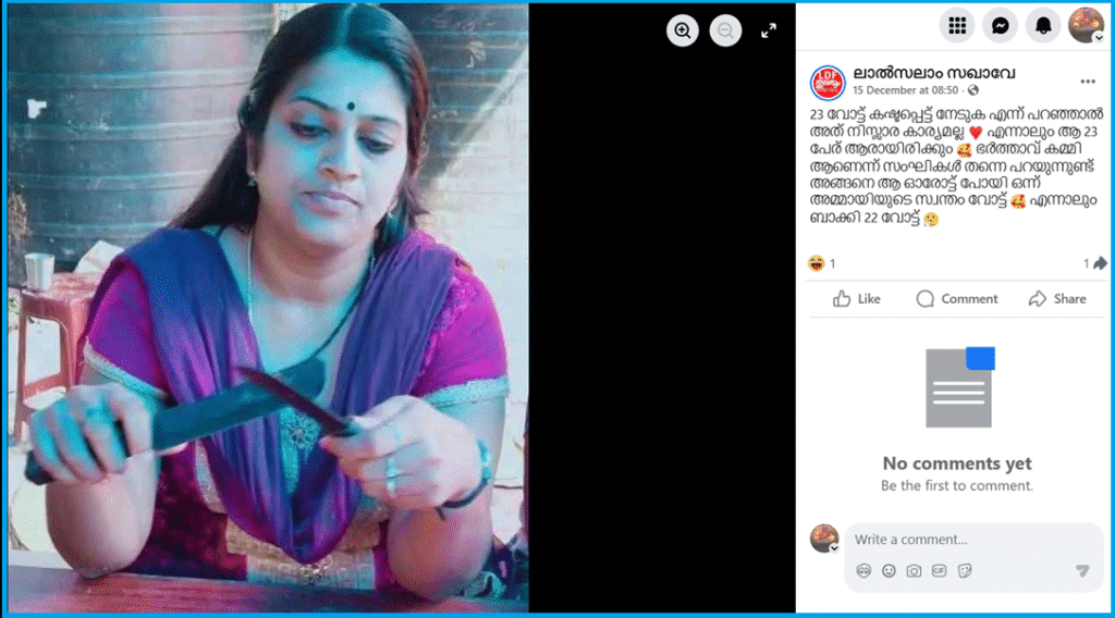 ലസിത പാലക്കലിന്റെ ചിത്രവും ഒപ്പം “23 വോട്ട് കഷ്ടപ്പെട്ട് നേടുക എന്ന് പറഞ്ഞാൽ അത് നിസ്സാര കാര്യമല്ല എന്നാലും ആ 23 പേര് ആരായിരിക്കും ഭർത്താവ് കമ്മി ആണെന്ന് സംഘികൾ തന്നെ പറയുന്നുണ്ട് അങ്ങനെ ആ ഓരോട്ട് പോയി ഒന്ന് അമ്മായിയുടെ സ്വന്തം വോട്ട് എന്നാലും ബാക്കി 22 വോട്ട് ” എന്ന വാചകങ്ങളുമാണ് പ്രചരിക്കുന്നത്.