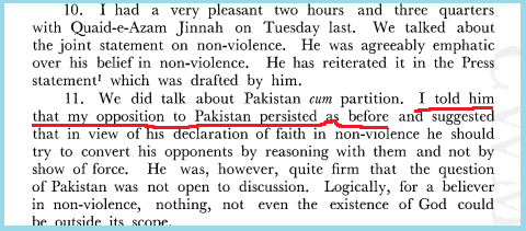 ജിന്നയെ മഹാത്മാ ഗാന്ധി സന്ദർശിച്ചപ്പോൾ അദ്ദേഹത്തിൻ്റെ പാകിസ്ഥാനിന്നോട് എതിർപ്പ് അദ്ദേഹം രേഖപ്പെടുത്തിയിരുന്നു എന്ന് കത്തിൽ ഗാന്ധിജി എഴുതുന്നു. ഇങ്ങനെ പല സന്ദർഭത്തിൽ അദ്ദേഹം ഇന്ത്യയുടെ വിഭജനവും പാകിസ്ഥാനിനെതിരെയും പ്രസ്താവനകൾ നടത്തിയിട്ടുണ്ട്. അദ്ദേഹം ഇന്ത്യയുടെ വിഭജനം അംഗീകരിച്ചതായി എവിടെയും പറഞ്ഞിട്ടില്ല.