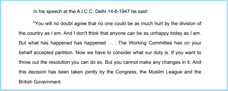“എന്നോട് കൂടുതൽ ആർക്കും ഇന്ത്യയുടെ വിഭജനം മൂലം വേദന ഉണ്ടാവില്ല എന്ന് നിങ്ങൾ എല്ലാവരും സമ്മതിക്കും. കൂടാതെ ആർക്കും ഈ കാര്യത്തിനെ തുടർന്ന് എന്നോട് കൂടുതൽ വിഷമമുണ്ടാകില്ല എന്ന് ഞാൻ ചിന്തിക്കുന്നു.”