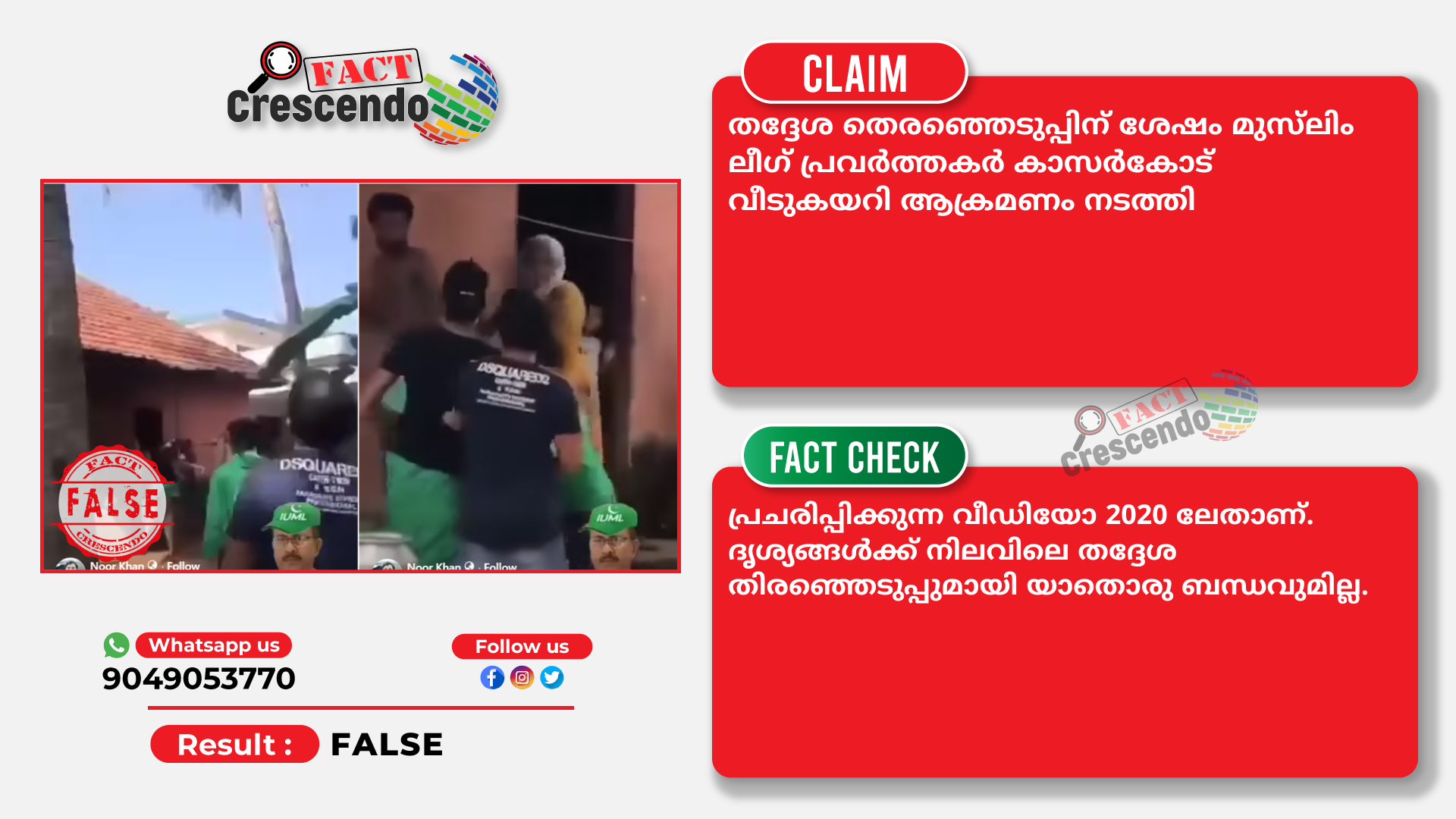 തദ്ദേശ തിരഞ്ഞെടുപ്പിന് ശേഷം  മുസ്‍ലിം ലീഗ് പ്രവര്‍ത്തകര്‍ കാസര്‍കോട് വീടുകയറി ആക്രമണം നടത്തി എന്ന് പ്രചരിപ്പിക്കുന്ന  വീഡിയോ 2020 ലേതാണ്. ദൃശ്യങ്ങള്‍ക്ക് നിലവിലെ തദ്ദേശ തിരഞ്ഞെടുപ്പുമായി യാതൊരു ബന്ധവുമില്ല.