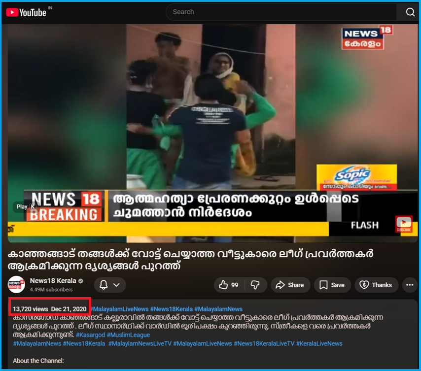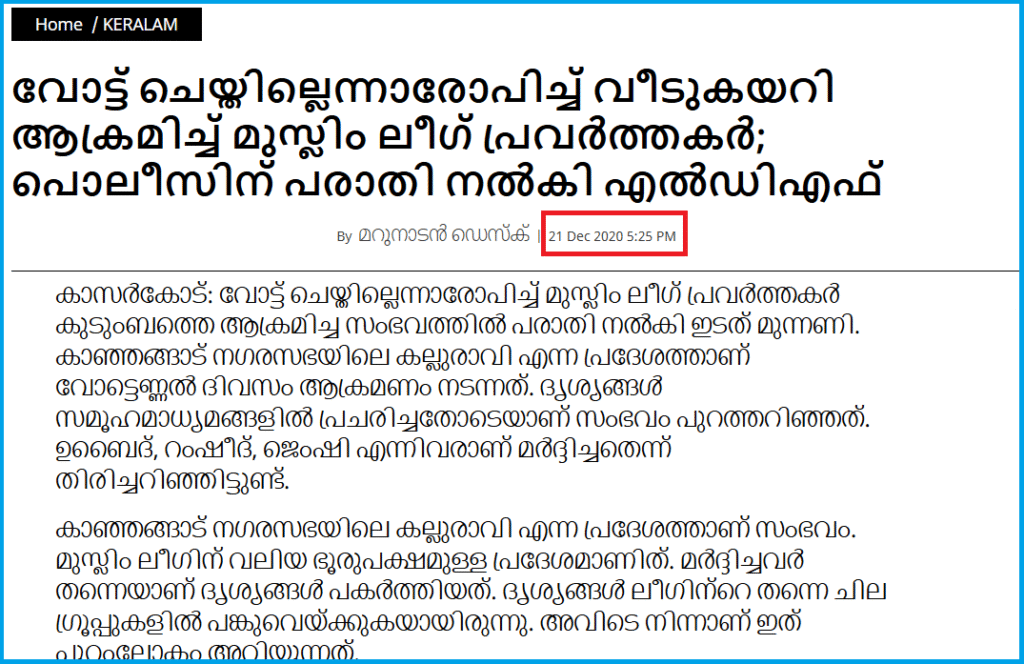 ഞങ്ങള്‍ വീഡിയോ കീഫ്രെയിമുകളുടെ റിവേഴ്സ് ഇമേജ് അന്വേഷണം നടത്തിയപ്പോള്‍ ലഭിച്ച പഴയ മാധ്യമ റിപ്പോര്‍ട്ടുകള്‍ അനുസരിച്ച് സംഭവം 2020 ഡിസംബറില്‍ നടന്നതാണ്, ഇപ്പോഴല്ല. റിപ്പോര്‍ട്ടില്‍ സംഭവം കാഞ്ഞങ്ങാട് പഞ്ചായത്തിലെ കല്ലുരാവിയിലാണ് നടന്നത് എന്ന് വ്യക്തമാക്കിയിട്ടുണ്ട്. “മുസ്ലിം ലീഗിന് വലിയ ഭൂരുപക്ഷമുള്ള പ്രദേശമാണിത്. മർദ്ദിച്ചവർ തന്നെയാണ് ദൃശ്യങ്ങൾ പകർത്തിയത്. ദൃശ്യങ്ങൾ ലീഗിന്‍റെ തന്നെ ചില ഗ്രൂപ്പുകളിൽ പങ്കുവെയ്ക്കുകയായിരുന്നു. അവിടെ നിന്നാണ് ഇത് പുറംലോകം അറിയുന്നത്. മുസ്ലിം ലീഗിന് വോട്ട് ചെയ്തില്ലെന്നരോപിച്ചാണ് കുടുംബത്തെ വീട്ടിൽകയറി മർദ്ദിച്ചത്. എന്നാൽ സംഭവത്തിൽ കുടുംബം പരാതി നൽകാൻ തയ്യാറായിരുന്നില്ല. ഇതോടെ എൽഡിഎഫ് ഇതിനെതിരേ ഹോസ്ദുർഗ് പൊലീസിൽ പരാതി നൽകുകയായിരുന്നു” എന്നും റിപ്പോര്‍ട്ട് പറയുന്നു.