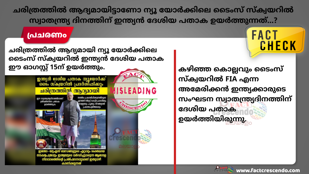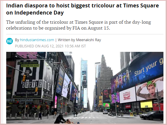 ഇന്ത്യയുടെ 75ആം സ്വതന്ത്ര ദിനത്തിന്റെ ആഘോഷത്തിന്റെ ഭാഗമായി ചരിത്രത്തില് ആദ്യമായി ന്യൂ യോര്ക്കിലെ ടൈംസ് സ്ക്വയറില് ഇന്ത്യയുടെ ത്രിവര്ണ്ണ പതാക ഉയര്ത്തും എന്ന പ്രചരണം സാമുഹ മാധ്യമങ്ങളില് നടക്കുന്നുണ്ട്.