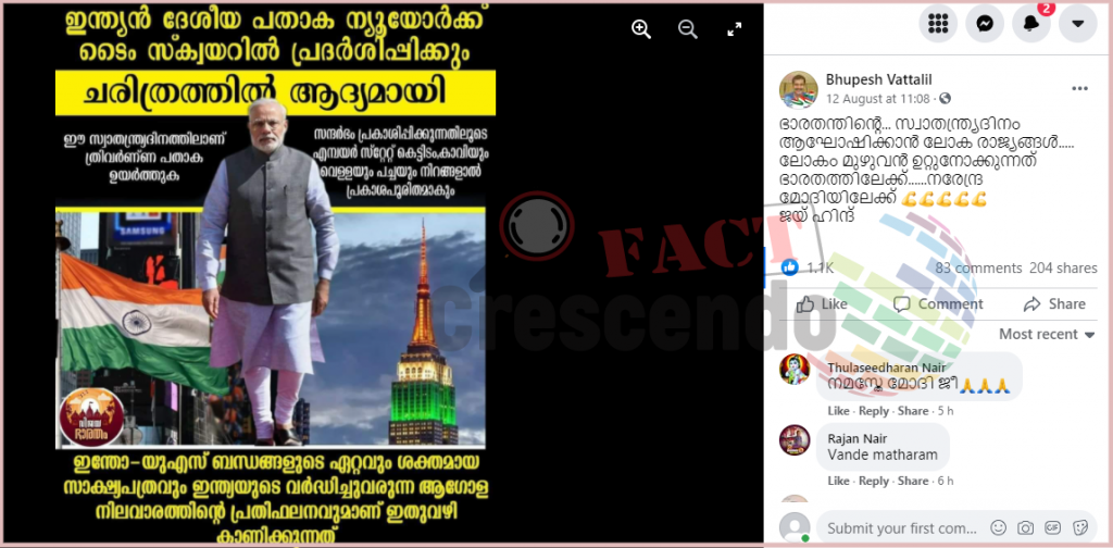 മുകളില് നല്കിയ പോസ്റ്ററില് പറയുന്നത് ഇങ്ങനെയാണ്: “ഇന്ത്യന് ദേശിയ പതാക ന്യുയോര്ക്ക് ടൈം സ്ക്വറില് പ്രദര്ശിപ്പിക്കും ചരിത്രത്തില് ആദ്യമായി…ഈ സ്വാതന്ത്ര ദിനത്തിലാണ് ത്രിവര്ണ പതാക ഉയര്ത്തുക…സന്ദര്ഭം പ്രകാശിപ്പിക്കുന്നതിലുടെ എമ്പായര് സ്റ്റേറ്റ് കെട്ടിടംകാവിയും വെള്ളയും പച്ചയും നിറങ്ങള് പ്രകാശപുരിതമാകും…ഇന്തോ-യുഎസ് ബന്ധങ്ങളുടെ ഏറ്റവും ശക്തമായ സാക്ഷ്യപ്രതവും ഇന്ത്യയുടെ വര്ദ്ധിച്ചുവരുന്ന ആഗോള നിലവാരത്തിന്റെ പ്രതിഫലനവുമാണ് ഇതുവഴി കാണിക്കുന്നത് ”