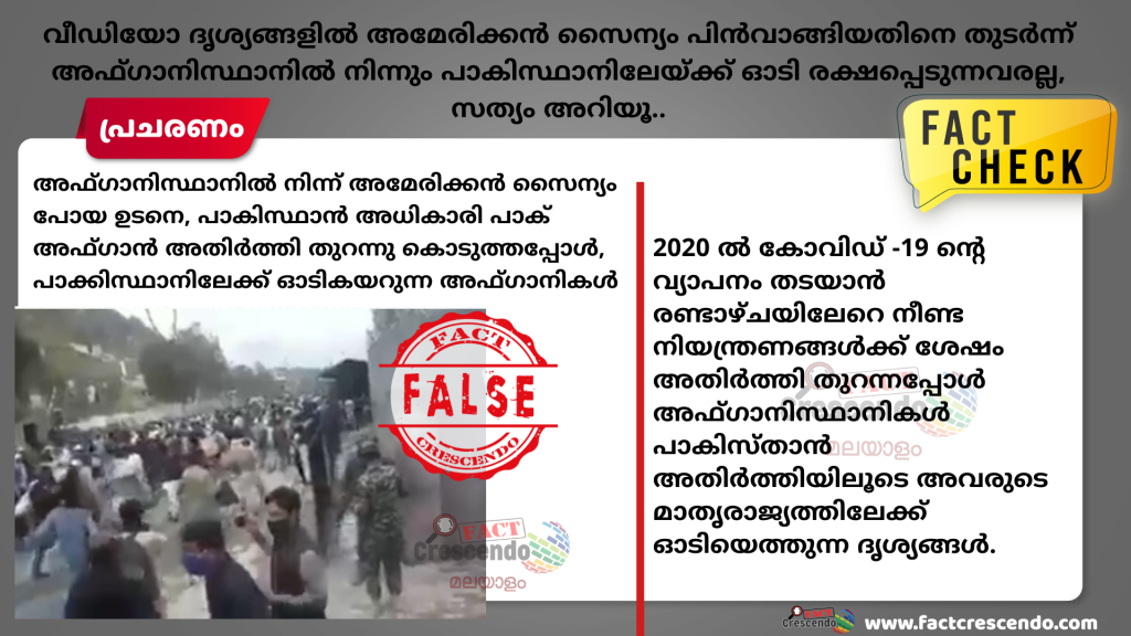 പോസ്റ്റിലെ പ്രചരണം പൂർണ്ണമായും തെറ്റാണ്. ഇത് അഫ്ഗാനിസ്ഥാനില് താലിബാന് അധികാരം പിടിച്ചെടുത്ത സാഹചര്യത്തില് അഫ്ഗാനിസ്ഥാനില് നിന്നും രക്ഷപ്പെട്ടു പോകുന്നവരുടെ ദൃശ്യങ്ങളല്ല. 2020 ഏപ്രിൽ മാസത്തില് കോവിഡ് നിയന്ത്രണത്തിന്റെ ഭാഗമായി നിർബന്ധിത ക്വാറന്റൈന് ശേഷം പാക്കിസ്ഥാനിൽ നിന്നും മാതൃരാജ്യമായ അഫ്ഗാനിസ്ഥാനിലേക്ക് പോകുന്നവരുടെ ദൃശ്യങ്ങളാണിത്. നിലവിലെ അഫ്ഗാനിസ്ഥാൻ സംഘർഷവുമായി ദൃശ്യങ്ങള്ക്ക് യാതൊരു ബന്ധവുമില്ല.