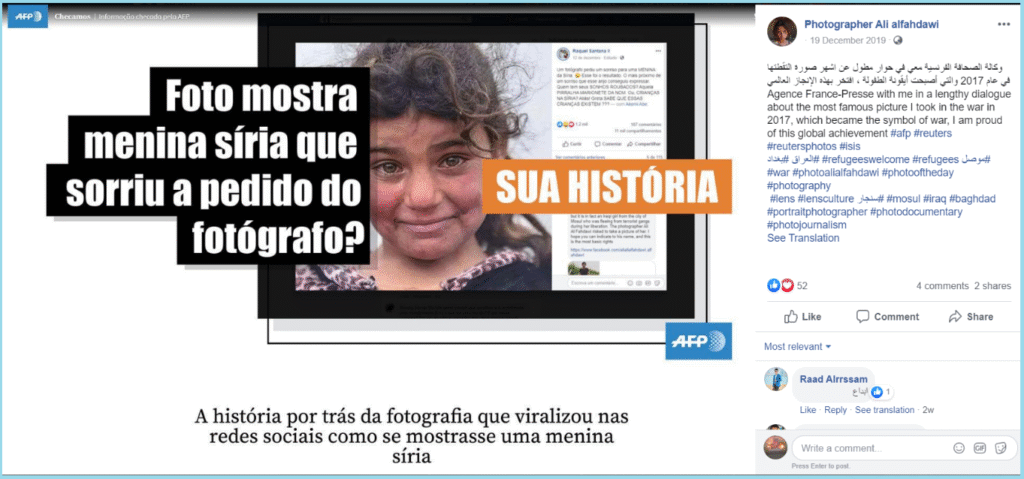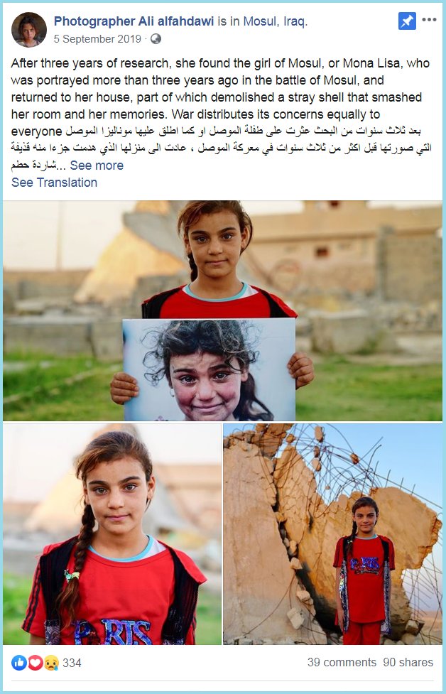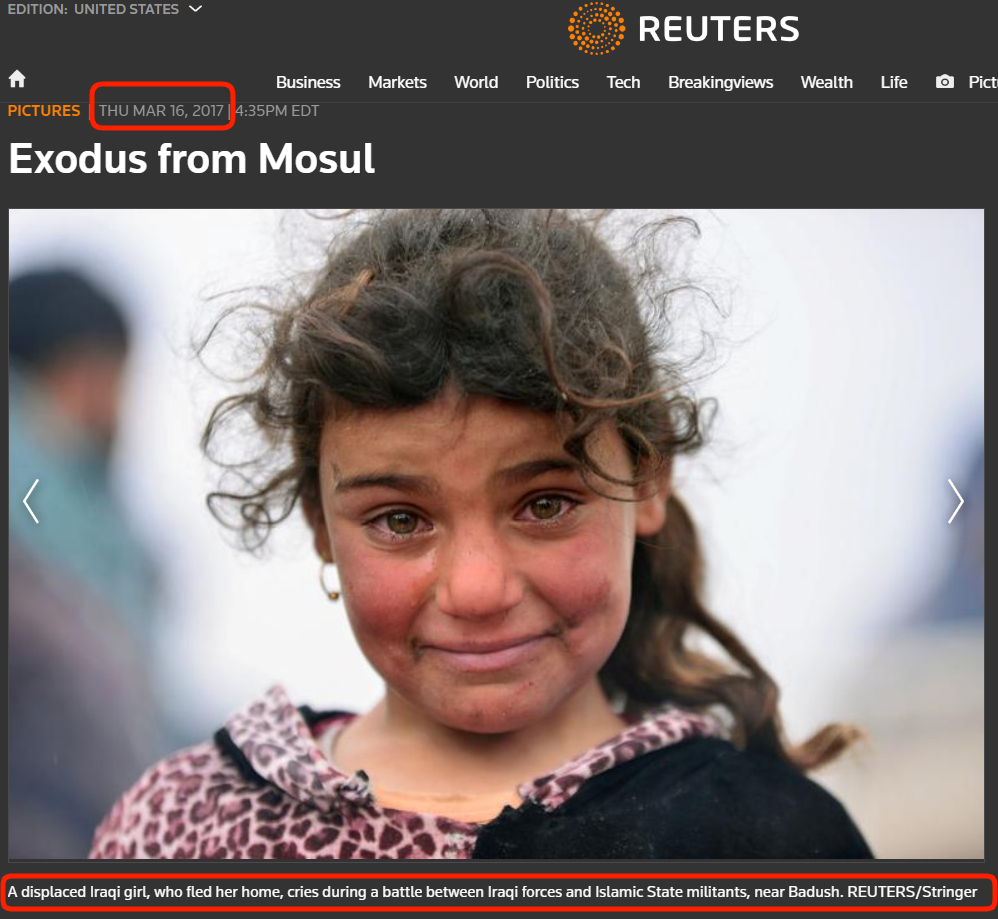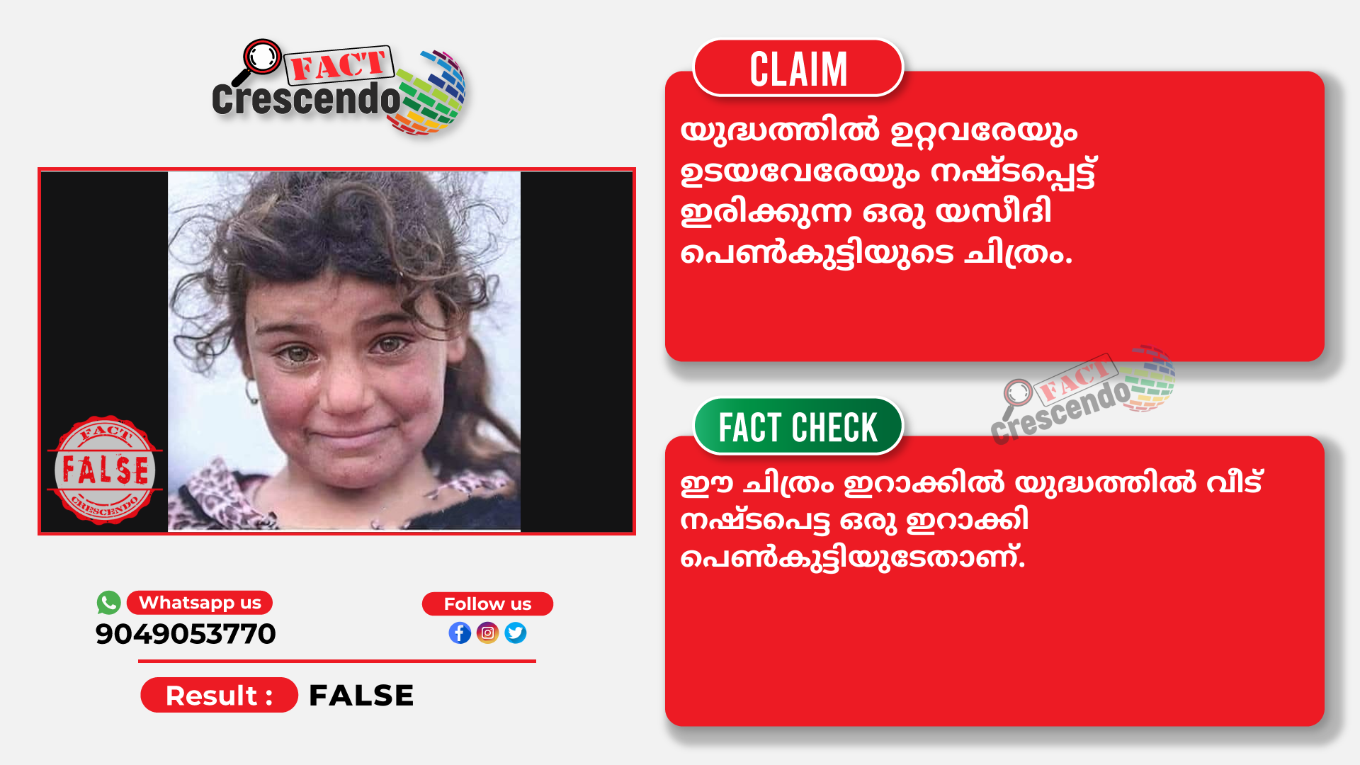 യുദ്ധത്തിൽ ഉറ്റവരേയും ഉടയവേരേയും നഷ്ടപ്പെട്ട് ഇരിക്കുന്ന ഒരു യസീദി പെൺകുട്ടിയുടെ ചിത്രം എന്ന തരത്തിൽ പ്രചരിപ്പിക്കുന്നത് 2014 ൽ ആരംഭിച്ച യുദ്ധത്തിൽ വീട് നഷ്ടപ്പെട്ട ഇറാക്കി പെൺകുട്ടിയുടെ ചിത്രമാണ്.