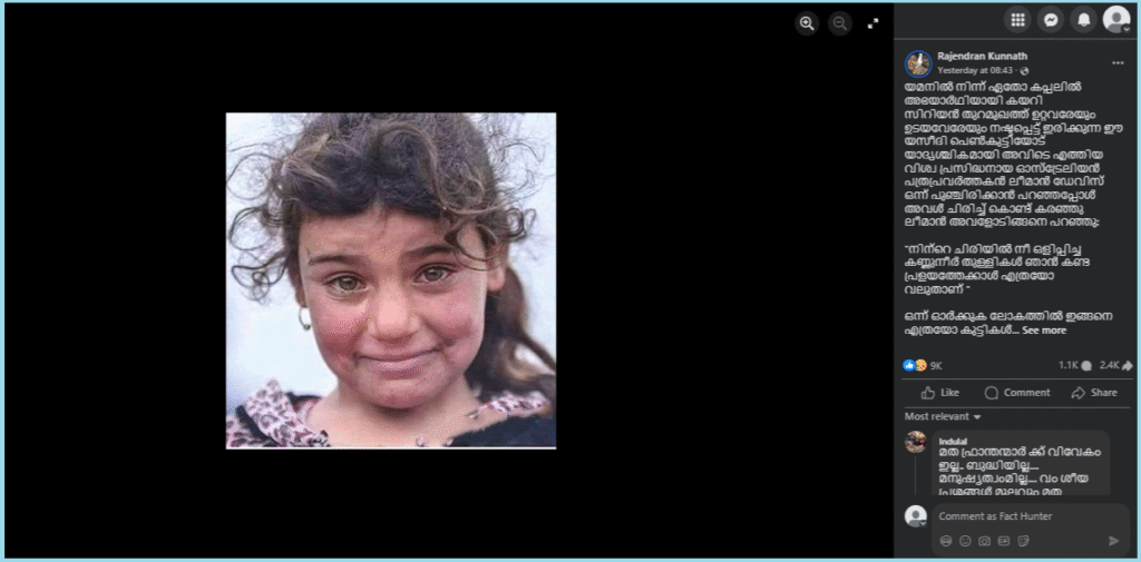 മുകളിൽ നൽകിയ പോസ്റ്റിൽ നമുക്ക് ഒരു ചിത്രം കാണാം. ചിത്രത്തിൽ നമുക്ക് ഒരു പെൺകുട്ടി സങ്കടത്തിനിടെ ചിരിക്കാൻ ശ്രമിക്കുന്നതായി കാണാം. പോസ്റ്റിൻ്റെ അടിക്കുറിപ്പ് ഇപ്രകാരമാണ്: “യമനിൽ നിന്ന് ഏതോ കപ്പലിൽ അഭയാർഥിയായി കയറി സിറിയൻ തുറമുഖത്ത് ഉറ്റവരേയും ഉടയവേരേയും നഷ്ടപ്പെട്ട് ഇരിക്കുന്ന ഈ യസീദി പെൺകുട്ടിയോട് യാദൃശ്ചികമായി അവിടെ എത്തിയ വിശ്വ പ്രസിദ്ധനായ ഓസ്ട്രേലിയൻ പത്രപ്രവർത്തകൻ ലീമാൻ ഡേവിസ് ഒന്ന് പുഞ്ചിരിക്കാൻ പറഞ്ഞപ്പോൾ അവൾ ചിരിച്ച് കൊണ്ട് കരഞ്ഞു ലീമാൻ അവളോടിങ്ങനെ പറഞ്ഞു: “നിന്റെ ചിരിയിൽ നീ ഒളിപ്പിച്ച കണ്ണുനീർ തുള്ളികൾ ഞാൻ കണ്ട പ്രളയത്തേക്കാൾ എത്രയോ വലുതാണ് ” ഒന്ന് ഓർക്കുക ലോകത്തിൽ ഇങ്ങനെ എത്രയോ കുട്ടികൾ ഉത്തരമില്ലാത്ത ചില ചോദ്യങ്ങൾ അവശേഷിപ്പിച്ചു കൊണ്ട്: പാലായനത്തിന്റെ ഭാരവുമായി യുദ്ധ കൊതിയന്മാരായ ഭരണാധികാരികളുടെയും മതഭ്രാന്തൻമാരുടെയും നിഷ്ഠൂരതയുമായി ഉഴലുന്നു അവളുടെ കണ്ണിൽ ആകുലതയുടെ ഒരു മഹാ സമുദ്രമുണ്ട് ! മകളെ നീ എന്റെയും ലോകത്തിന്റേയും മകളാണ്. നിന്റെ കണ്ണീരിന് കാരണമായ എല്ലാറ്റിനേയും ഞാൻ വെറുക്കുന്നു. 🙏🙏❤️ ”