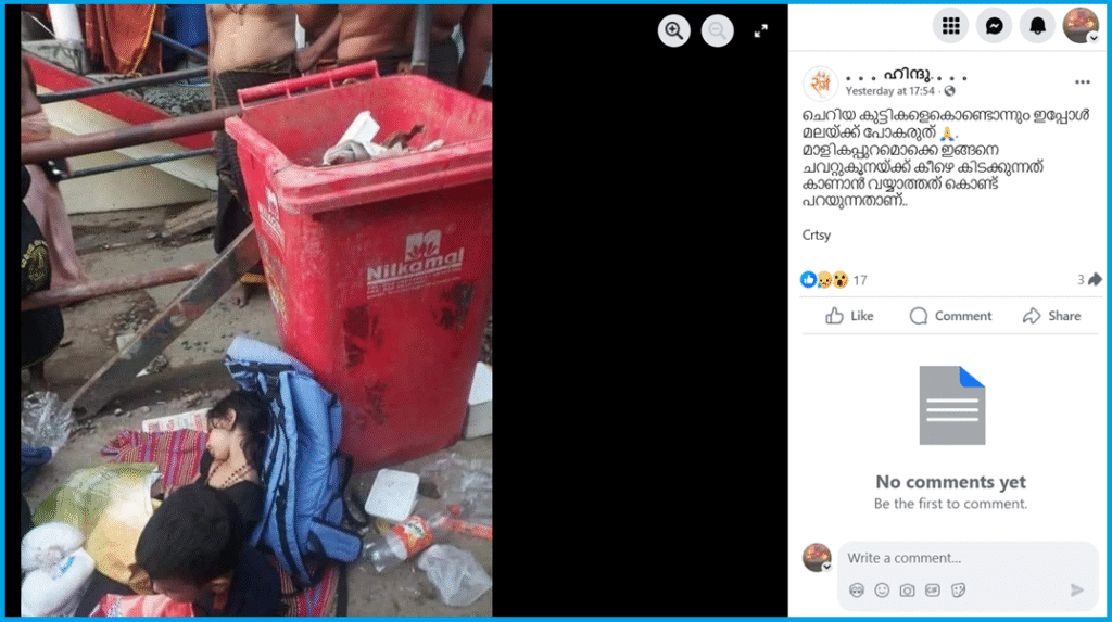 ചുറ്റും മാലിന്യങ്ങള് നിരന്നു കിടക്കുന്ന ഗാര്ബേജ് ബാസ്ക്കറ്റിന് സമീപം ചെറിയ പെണ്കുട്ടി ഉറങ്ങുന്ന ചിത്രമാണ് കാണുന്നത്. ഈ മണ്ഡലകാലം ആരംഭിച്ചപ്പോള് തന്നെ ശബരിമലയുടെ അവസ്ഥ ഇതാണ് എന്ന് സൂചിപ്പിച്ച് ഒപ്പമുള്ള വിവരണം ഇങ്ങനെ: “ചെറിയ കുട്ടികളെകൊണ്ടൊന്നും ഇപ്പോൾ മലയ്ക്ക് പോകരുത് .