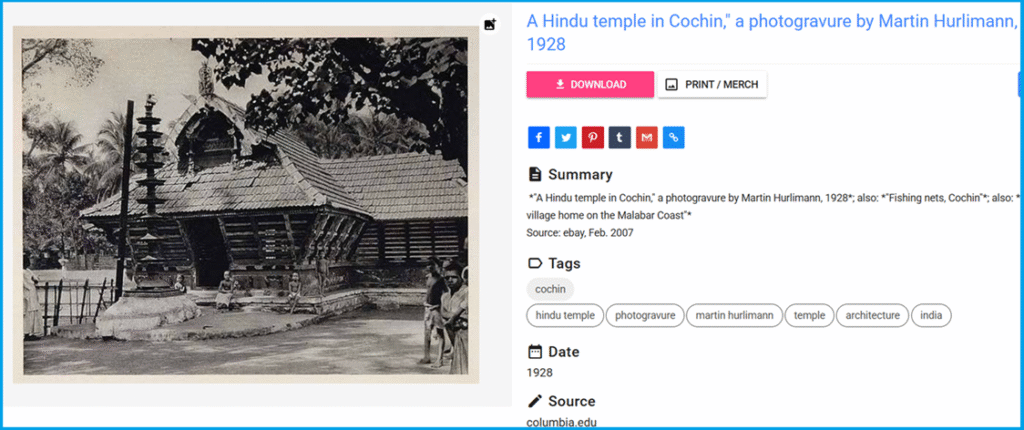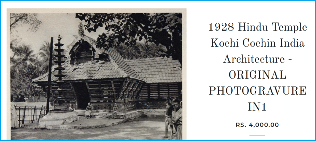“ഇന്ത്യയിലെ കൊച്ചിയിലെ (മുമ്പ് കൊച്ചിന്) ഒരു ഹിന്ദു ക്ഷേത്രത്തിന്റെ 1928-ൽ എടുത്ത ഒരു യഥാർത്ഥ ഫോട്ടോഗ്രേവറാണിത്. മാർട്ടിൻ ഹുർലിമാൻ എടുത്ത ഫോട്ടോ.” എന്നാണ് ചിത്രത്തിനൊപ്പമുള്ള വിവരണം.