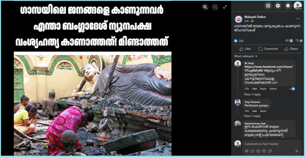 മുകളിൽ നൽകിയ പോസ്റ്റിൽ നമുക്ക് ഒരു ചിത്രം കാണാം. ചിത്രത്തിൽ ആക്രമിച്ച് കത്തിച്ച ബുദ്ധ ഭഗവാൻ്റെ പ്രതിമയുടെ മുന്നിൽ ചിലർ പ്രാർത്ഥിക്കുന്നതായി കാണാം. പോസ്റ്റിൻ്റെ അടിക്കുറിപ്പ് ഇപ്രകാരമാണ്: