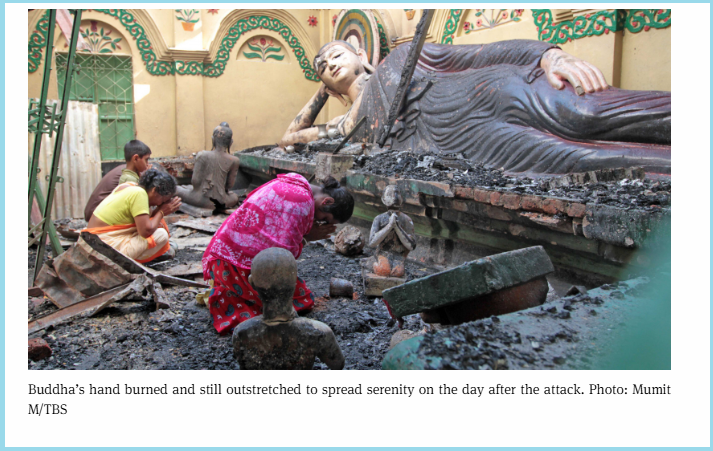 വാർത്ത പ്രകാരം 2012ൽ ബംഗ്ലാദേശിലെ കോക്സ് ബസാറിലെ രാമു എന്ന ഗ്രാമത്തിൽ നടന്ന വർഗീയ കലാപത്തിൽ നശിക്കപ്പെട്ട ബുദ്ധ പ്രതിമയുടെതാണ്. സെപ്റ്റംബർ 2012ൽ ഉത്തം ബറുവ എന്ന ബുദ്ധിസ്റ്റ് പൗരൻ വിശുദ്ധ ഖുർആനെ അപകീർത്തിപെടുത്തി എന്ന കള്ള ആരോപണം ഉന്നയിച്ച് 25000 മുസ്ലിങ്ങൾ രാമുവിൽ ആക്രമിച്ചു. ഈ ആക്രമണം മുൻകൂട്ടി ആസൂത്രണം ചെയ്തതായിരുന്നു എന്ന് ദി ഡെയിലി സ്റ്റാറും അന്നത്തെ പ്രധാനമന്ത്രി ഷെയ്ഖ് ഹസീന നിയോഗിച്ച അന്വേഷണ സംഘവും കണ്ടെത്തി. ഉത്തം ബറുവയുടെ പേരിൽ വ്യാജ പോസ്റ്റ് ഉണ്ടാക്കി മുസ്ലിംകളെ പ്രകോപ്പിച്ച് ബുദ്ധ മതകർക്കെതിരെ നടത്തിയ കലാപമായിരുന്നു ഇത്. ഈ കലാപത്തിൽ ബുദ്ധ അനുയായികളുടെ വീടുകളും ക്ഷേത്രങ്ങളും കലാപകാരികൾ കത്തിച്ചു. ഇതിൽ ഒന്നായിരുന്നു നമ്മൾ ചിത്രത്തിൽ കാണുന്ന സദാ ചിത് ബിഹാറിലെ ഈ ബുദ്ധ പ്രതിമ. ബംഗ്ലാദേശ് മാധ്യമ പ്രസ്ഥാനം ദി ബിസിനസ് സ്റ്റാൻഡേർഡിൻ്റെ മുമിത് എം. ആണ് ഈ ചിത്രം പകർത്തിയത്.