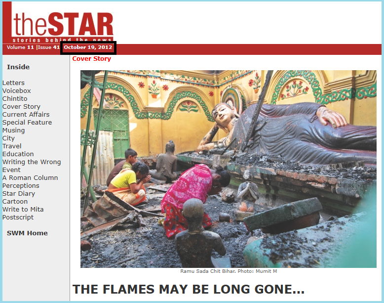 ഞങ്ങൾ ഈ ചിത്രത്തിനെ ഗൂഗിളിൽ റിവേഴ്സ് ഇമേജ് അന്വേഷണം നടത്തി പരിശോധിച്ചപ്പോൾ ഈ ചിത്രം പഴയതാണെന്ന് കണ്ടെത്തി. ബംഗ്ലാദേശി മാധ്യമ വെബ്സൈറ്റ് ദി സ്റ്റാർ 19 ഒക്ടോബർ 2012ന് പ്രസിദ്ധികരിച്ച ഒരു വാർത്തയിൽ ഈ ചിത്രം ലഭ്യമാണ്.
