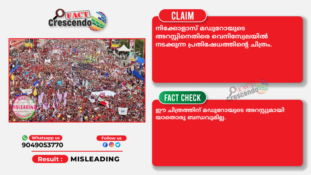 നിക്കോളാസ് മഡുറോയുടെ അറസ്റ്റിനെതിരെ വെനിസ്വേലയിൽ നടക്കുന്ന പ്രതിഷേധം എന്ന തരത്തിൽ ഒരു ചിത്രം സമൂഹ മാധ്യമങ്ങളിൽ പ്രചരിപ്പിക്കുന്നുണ്ട്.