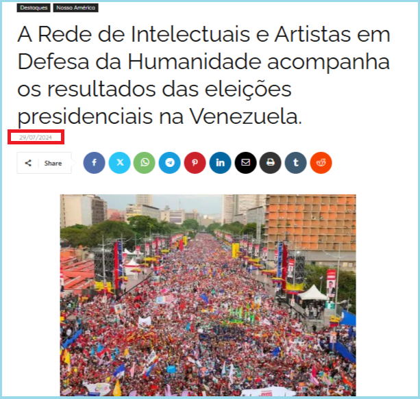 ഈ വാർത്ത പ്രകാരം ഈ ജാഡ വെനിസ്വേലയിൽ മഡുറോയുടെ തെരെഞ്ഞെടുപ്പ് വിജയാഘോഷത്തിൻ്റെതാണ്. ഈ ചിത്രം ജൂലൈ 24ന് മറ്റൊരു ബ്രസീലിയൻ വെബ്സൈറ്റ് ദേസകാറ്റോ പ്രസിദ്ധികരിചിതായി നമുക്ക് കാണാം.