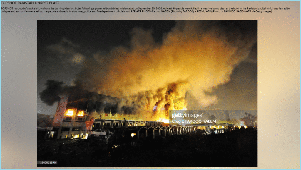 ഈ വീഡിയോയിൽ പറയുന്ന മാരിയറ്റ് ഹ്യാട്ട് ഹോട്ടൽ ഞങ്ങൾ അന്വേഷിച്ചപ്പോൾ ഇത്തരം പേരുള്ള യാതൊരു ഹോട്ടൽ എവിടെയും കണ്ടെത്തിയില്ല. ഇസ്ലാമബാദിൽ മാരിയറ്റ് ഹോട്ടൽ ഉണ്ട്. പക്ഷെ ഈ ഹോട്ടലിന് നേരെ ഭീകരാക്രമണമോ ബോംബ് സ്ഫോടനം നടന്നു എന്ന തരത്തിൽ യാതൊരു വാർത്ത റിപ്പോർട്ട് ചെയ്തിട്ടില്ല. ഈ ദൃശ്യങ്ങളിൽ കാണിക്കുന്ന ഹോട്ടൽ ഇസ്ലാമബാദ് മാരിയറ്റ് ആണ്. 2008ൽ ഈ ഹോട്ടലിന് നേരെ ഭീകരവാദികൾ ആക്രമിച്ചിരുന്നു. ഈ 17 കൊല്ലം പഴയ സംഭവത്തിൻ്റെ ചിത്രമാണ് ദൃശ്യങ്ങളിൽ കാണിക്കുന്നത്. ഈ ചിത്രം ഗേറ്റി ഇമേജസ് എന്ന സ്റ്റോക്ക് ഫോട്ടോ വെബ്സൈറ്റിൽ ഞങ്ങൾക്ക് റിവേഴ്സ് ഇമേജ് അന്വേഷണത്തിൽ കണ്ടെത്തി.