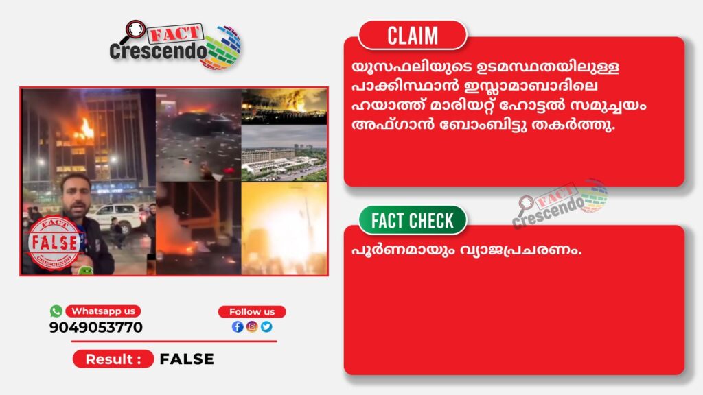 യൂസഫലിയുടെ ഉടമസ്ഥതയിലുള്ള പാക്കിസ്ഥാന് ഇസ്ലാമാബാദിലെ ഹയാത്ത് മാരിയറ്റ് ഹോട്ടല് സമുച്ചയം അഫ്ഗാന് ബോംബിട്ടു തകർക്കുന്നത്തിൻ്റെ ദൃശ്യങ്ങൾ എന്ന തരത്തിൽ സമൂഹ മാധ്യമങ്ങളിൽ നടക്കുന്ന പ്രചരണം പൂർണമായും തെറ്റാണെന്ന് അന്വേഷണത്തിൽ നിന്ന് വ്യക്തമാകുന്നു.