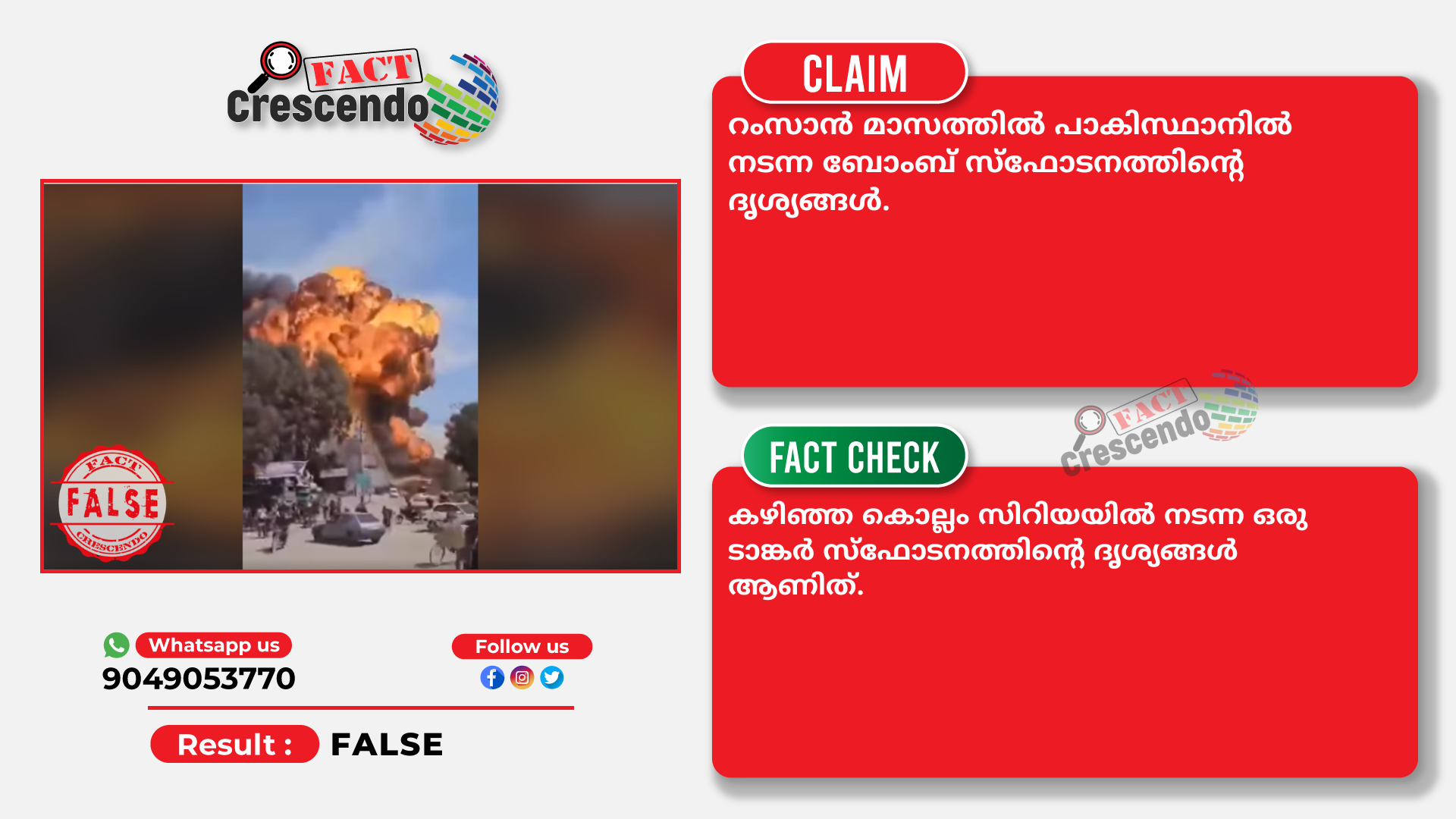 റംസാൻ മാസത്തിൽ പാകിസ്ഥാനിൽ നടന്ന ബോംബ് സ്ഫോടനത്തിന്റെ ദൃശ്യങ്ങൾ എന്ന തരത്തിൽ പ്രചരിപ്പിക്കുന്നത് കഴിഞ്ഞ കൊല്ലം സിറിയയിൽ നടന്ന ഒരു പെട്രോൾ ടാങ്കർ സ്ഫോടനത്തിൻ്റെതാണ്.