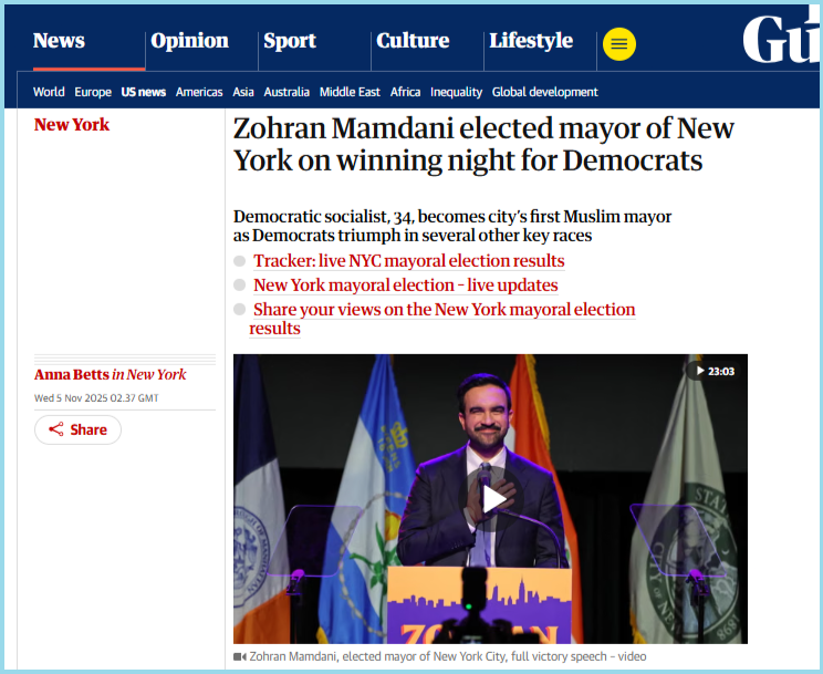 “സൊഹ്രാൻ മംദാനിയുടെ ന്യൂയോർക്ക് വലിയ മാറ്റത്തിലേക്ക്. പാലസ്തീൻ പതാക ഉയർത്താൻ അമേരിക്കൻ പതാക വലിച്ചപറിച്ച് താഴെയിടുന്നു. മാൻഹട്ടന് മുകളിൽ ഉയർന്നു നിൽക്കുന്ന സ്റ്റാച്യു ഓഫ് ലിബർട്ടിയുടെ സ്ഥാനത്ത് നിന്ന് ഏതാനും കിലോമീറ്റർ അകലെ, അമേരിക്കൻ പതാക കീറിമുറിച്ച് അതിന്റെ സ്ഥാനത്ത് പലസ്തീൻ പതാക ഉയർത്തുന്ന ഒരു ക്കൂട്ടം ജനങ്ങൾ ”