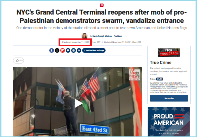 വാർത്ത പ്രകാരം നവംബർ 2023ൽ പലസ്തീൻ അനുകൂല പ്രതിഷേധത്തിൽ ഒരു പ്രതിഷേധകൻ മാൻഹാട്ടനിലെ ഗ്രാൻഡ് സെൻട്രൽ ടെർമിനലിൻ്റെ സമീപം ഒരു പോസ്റ്റിൻ്റെ മുകളിൽ കയറി അമേരിക്കയുടെ പതാക വലിച്ച് താഴെയിട്ടു. ഈ വീഡിയോ ടൈംസ് ഓഫ് ഇന്ത്യയും 12 നവംബർ 2023ന് അവരുടെ യുട്യൂബ് ചാനലിൽ പ്രസിദ്ധികരിച്ചിട്ടുണ്ട്.