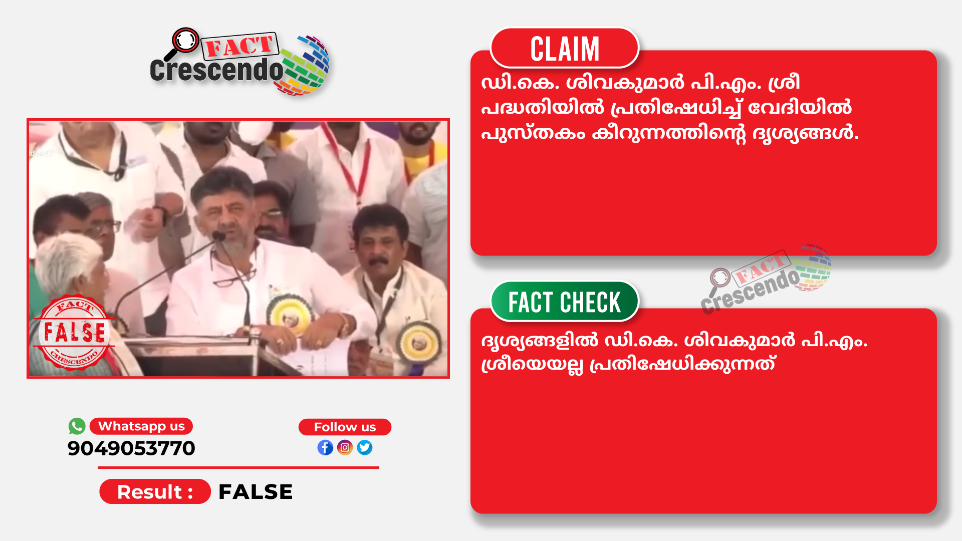ഡി.കെ. ശിവകുമാർ പി.എം. ശ്രീ പദ്ധതിയില് പ്രതിഷേധിച്ച് വേദിയിൽ പുസ്തകം കീറുന്നത്തിൻ്റെ ദൃശ്യങ്ങൾ എന്ന തരത്തിൽ ഒരു വീഡിയോ സമൂഹ മാധ്യമങ്ങളിൽ പ്രചരിപ്പിക്കുന്നുണ്ട്.