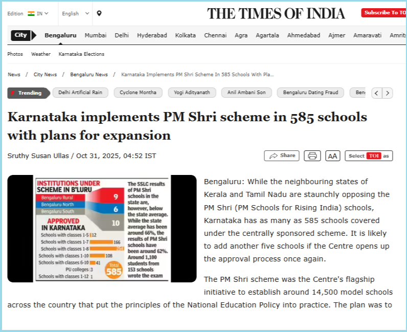 കർണാടക സർക്കാർ പി.എം. ശ്രീ നടപ്പിലാക്കില്ല എന്ന തരത്തിൽ യാതൊരു റിപോർട്ടുകളും കണ്ടെത്തിയില്ല. പകരം 31 ഒക്ടോബർ 2025ന് ടൈംസ് ഓഫ് ഇന്ത്യ പ്രസിദ്ധികരിച്ച വാർത്ത പ്രകാരം 585 വിദ്യാലയങ്ങളിൽ കർണാടക സർക്കാർ പി.എം. ശ്രീ പദ്ധതി നടപ്പിലാക്കിയിട്ടുണ്ട്. ഉടനെ വിദ്യാലയങ്ങളുടെ എണ്ണം കൂട്ടും എന്നും വാർത്തയിൽ പറയുന്നുണ്ട്.