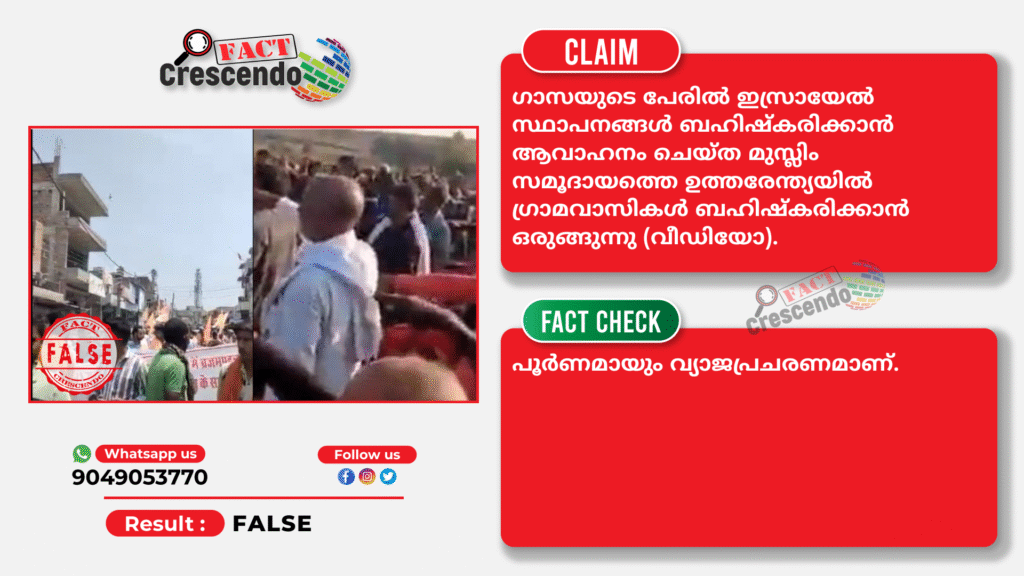 ഗാസയുടെ പേരിൽ ഇസ്രായേൽ സ്ഥാപനങ്ങൾ ബഹിഷ്കരിക്കാൻ ആവാഹനം ചെയ്ത മുസ്ലിം സമൂദായത്തെ ഉത്തരേന്ത്യയിൽ ഗ്രാമവാസികൾ ബഹിഷ്കരിക്കാൻ ഒരുങ്ങുന്നു എന്ന തരത്തിൽ ഒരു വീഡിയോ സമൂഹ മാധ്യമങ്ങളിൽ പ്രചരിപ്പിക്കുന്നുണ്ട്.