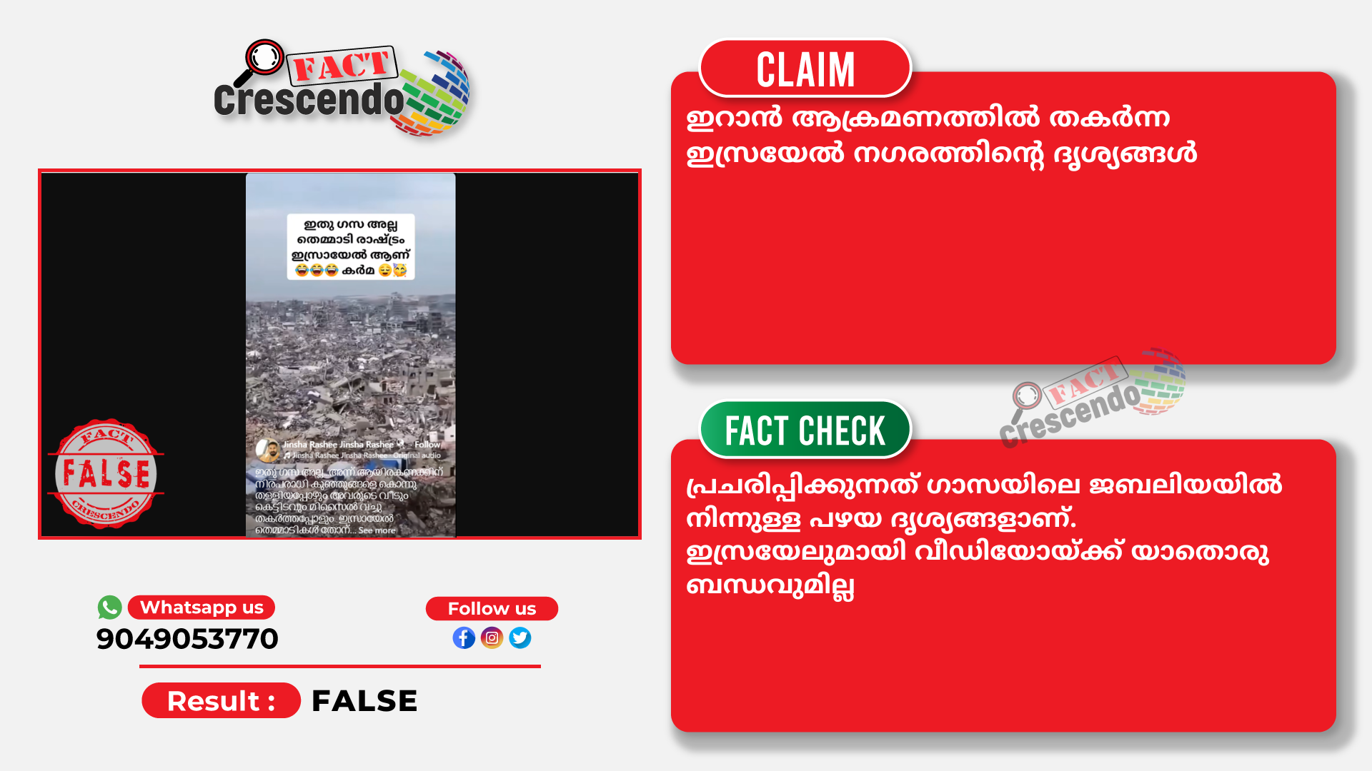 ഇറാന്‍ ആക്രമണത്തിൽ തകർന്ന ഇസ്രയേൽ നഗരമെന്ന് പ്രചരിപ്പിക്കുന്നത് ഗാസയിലെ ജബലിയയിൽ നിന്നുള്ള പഴയ ദൃശ്യങ്ങളാണ്. ഇസ്രയേലുമായി വീഡിയോയ്ക്ക് യാതൊരു ബന്ധവുമില്ല.