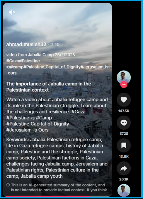 ഇതിൽ നിന്നും വീഡിയോ ഇസ്രായേലില്‍ നിന്നുള്ളതല്ലെന്നും 2025 ഫെബ്രുവരി 26ന് ജബലിയ അഭയാർത്ഥി ക്യാമ്പിൽ നിന്നും പകർത്തിയാകാമെന്നും അനുമാനിക്കുന്നു. അക്കൌണ്ടിൽ പങ്കുവച്ചിട്ടുള്ള വീഡിയോകളെല്ലാം സ്വയം പകർത്തിയവയാണെന്ന് അഹ്മദ് മുസ്ലേഹ് വ്യക്തമാക്കിയിട്ടുണ്ട്.