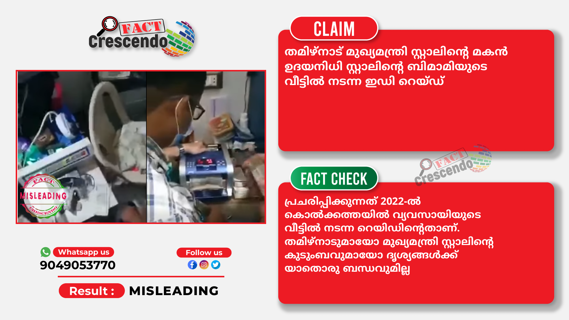 തമിഴ്നാട് മുഖ്യമന്ത്രി സ്റ്റാലിന്റെ മകന് ഉദയനിധി സ്റ്റാലിന്റെ ബിമാമിയുടെ വീട്ടില് നടന്ന ഇഡി റെയ്ഡ് എന്ന് പ്രചരിപ്പിക്കുന്നത് 2022-ൽ കൊൽക്കത്തയിൽ വ്യവസായിയുടെ വീട്ടില് നടന്ന റെയിഡിന് തമിഴ്നാടുമായോ മുഖ്യമന്ത്രി സ്റ്റാലിന്റെ കുടുംബവുമായോ ദൃശ്യങ്ങള്ക്ക് യാതൊരു ബന്ധവുമില്ല.