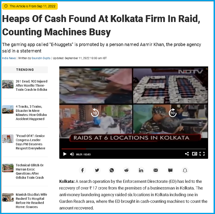 ഇഡി കൊൽക്കത്തയിലെ ഗാർഡൻ റീച്ച് ഏരിയയില് ഉൾപ്പെടെ ആറ് സ്ഥലങ്ങളിൽ റെയ്ഡ് നടത്തി, അവിടെ കണ്ടെടുത്ത തുക കണക്കാക്കാൻ ED ക്യാഷ് കൗണ്ടിംഗ് മെഷീനുകൾ കൊണ്ടുവന്നതായി 2022 സെപ്റ്റംബർ 11 ന് ന്യൂസ് 18 റിപ്പോർട്ട് ചെയ്തിരുന്നു.