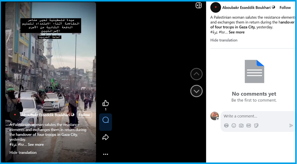 ഞങ്ങള് വീഡിയോ കീഫ്രെയിമുകളുടെ റിവേഴ്സ് ഇമേജ് അന്വേഷണം നടത്തിയപ്പോൾ സമാന വീഡിയോ 2025 ജനുവരി 26ന് ഒരു ഫേസ്ബുക്ക് അക്കൌണ്ടിൽ പങ്കുവച്ചിട്ടുള്ളതായി കണ്ടു. ‘ഇന്നലെ ഗാസ സിറ്റിയിൽ നാല് സൈനികരെ കൈമാറുന്ന വേളയിൽ ഒരു പലസ്തീൻ സ്ത്രീ ചെറുത്തുനിൽപ്പ് പോരാളികളെ അഭിവാദ്യം ചെയ്യുന്ന ദൃശ്യം’ എന്ന് അറബി ഭാഷയിലുള്ള അടിക്കുറിപ്പോടെയാണ് വീഡിയോ നല്കിയിട്ടുള്ളത്.