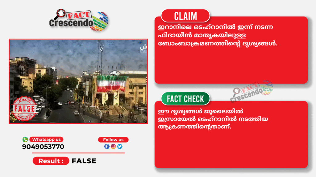 Title:ജൂലൈയിൽ ഇസ്രായേൽ ടെഹ്റാനിൽ നടത്തിയ ആമാക്രമണത്തിൻ്റെ ദൃശ്യങ്ങൾ ഇറാനിൽ ഫിദായീൻ മാത്രകയിലുള്ള ബോംബാക്രമണം എന്ന തരത്തിൽ പ്രചരിപ്പിക്കുന്നു