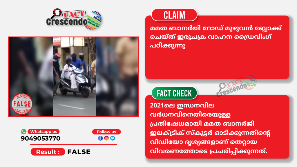 വീഡിയോയ്ക്കൊപ്പം ഉന്നയിച്ച അവകാശവാദം തെറ്റിദ്ധരിപ്പിക്കുന്നതും തെറ്റായതുമാണെന്ന് അന്വേഷണത്തില് വ്യക്തമായിട്ടുണ്ട്. വൈറൽ വീഡിയോയിൽ മമത ബാനർജി റോഡ് മുഴുവൻ ബ്ലോക്ക് ചെയ്ത് ഇരുചക്ര വാഹനത്തില് സഞ്ചരിക്കുന്നത് ഡ്രൈവിംഗ് പഠിക്കുവാനല്ല. 2021ലെ ഇന്ധനവില വർധനവിനെതിരെയുള്ള പ്രതിഷേധമായി മമത ബാനർജി ഇലക്ട്രിക് സ്കൂട്ടർ ഓടിക്കുന്നതിന്റെ വീഡിയോ ദൃശ്യങ്ങളാണ് തെറ്റായ വിവരണത്തോടെ പ്രചരിപ്പിക്കുന്നത്.
