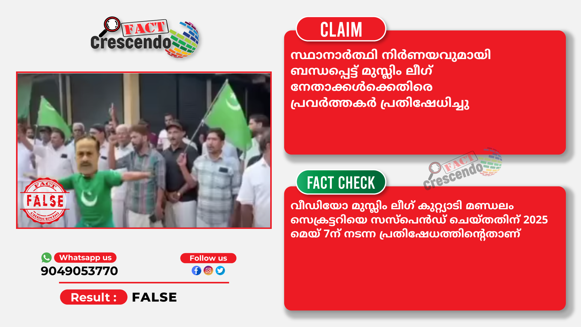 സ്ഥാനാർത്ഥി നിർണയവുമായി ബന്ധപ്പെട്ട് മുസ്ലിം ലീഗ് നേതാക്കൾക്കെതിരെ പ്രവർത്തകർ പ്രതിഷേധിച്ചു എന്ന് പ്രചരിപ്പിക്കുന്ന വീഡിയോ മുസ്ലിം ലീഗ് കുറ്റ്യാടി മണ്ഡലം സെക്രട്ടറിയെ സസ്പെൻഡ് ചെയ്തതിന് 2025 മെയ് 7ന് നടന്ന പ്രതിഷേധത്തിന്‍റെതാണ്.