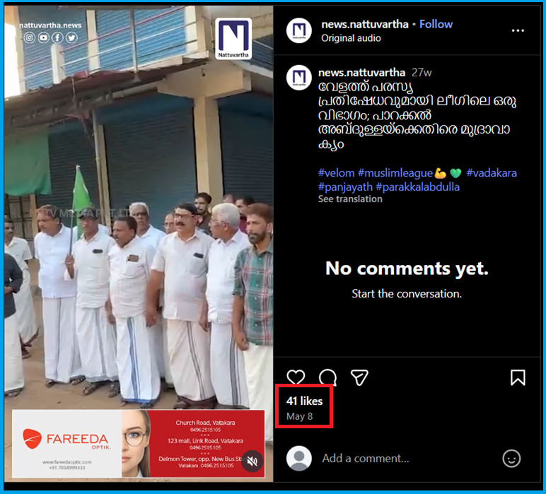 സലാം, പാറക്കൽ എന്നീ പേരുകൾ ചേർത്താണ് മുദ്രാവാക്യം വിളിക്കുന്നത്. ഈ സൂചന ഉപയോഗിച്ച് തിരഞ്ഞപ്പോള്‍ സമാന വീഡിയോ  ന്യൂസ് നാട്ടുവാര്‍ത്ത എന്ന ഇൻസ്റ്റഗ്രാം പേജിൽ 2025 മെയ് 8ന് പങ്കുവച്ചിട്ടുള്ളതായി കണ്ടു. ‘വേളത്ത് പരസ്യ പ്രതിഷേധവുമായി ലീഗിലെ ഒരു വിഭാഗം; പാറക്കൽ അബ്‌ദുള്ളയ്‌ക്കെതിരെ മുദ്രാവാക്യം’ എന്ന തലകെട്ടോടെയാണ് ഈ വീഡിയോ പങ്കുവച്ചിരിക്കുന്നത്.