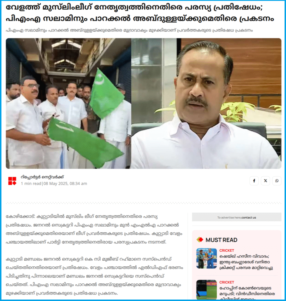 കൂടുതല്‍ തിരഞ്ഞപ്പോള്‍ കോഴിക്കോട് വേളത്ത് മുസ്‌ലിംലീഗ് നേതൃത്വത്തിനെതിരെ നടന്ന പരസ്യ പ്രതിഷേധവുമായി ബന്ധപ്പെട്ട് റിപ്പോർട്ടർ ടിവി പ്രസിദ്ധീകരിച്ച വാർത്ത ലഭിച്ചു. മുസ്ലിം ലീഗ് ജനറൽ സെക്രട്ടറി പിഎംഎ സലാമിനും മുൻ എംഎൽഎ പാറക്കല്‍ അബ്ദുളളയ്ക്കുമെതിരെയാണ് കുറ്റ്യാടി വേളം പഞ്ചായത്തിൽ ലീഗ് പ്രവർത്തകരുടെ പ്രതിഷേധം നടന്നതെന്ന് റിപ്പോർട്ടിൽ വ്യക്തമാക്കുന്നു. കുറ്റ്യാടി മണ്ഡലം ജനറല്‍ സെക്രട്ടറി കെസി മുജീബ് റഹ്‌മാനെ സസ്‌പെന്‍ഡ് ചെയ്തതിനെതിരെയായിരുന്നു പ്രതിഷേധം. വേളം പഞ്ചായത്തില്‍ എല്‍ഡിഎഫ് ഭരണം പിടിച്ചതിനു പിന്നാലെയാണ് മണ്ഡലം ജനറല്‍ സെക്രട്ടറിയെ സസ്‌പെന്‍ഡ് ചെയ്തതെന്നും റിപ്പോർട്ടിൽ പറയുന്നു.