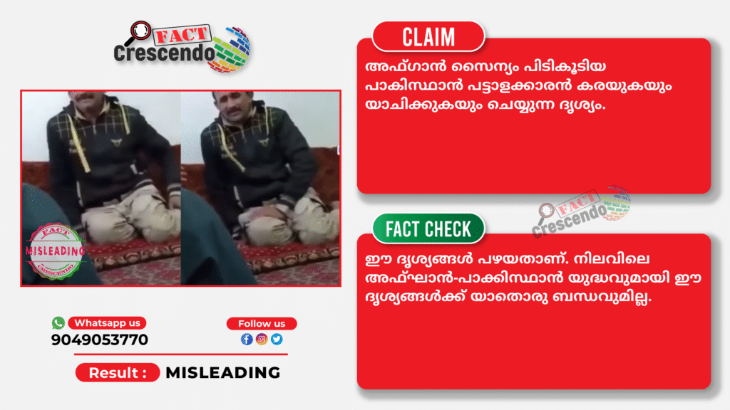 അഫ്ഗാൻ സൈന്യം പിടികൂടിയ പാകിസ്ഥാൻ പട്ടാളക്കാരൻ കരയുകയും യാചിക്കുകയും ചെയ്യുന്ന ദൃശ്യം എന്ന തരത്തിൽ ഒരു വീഡിയോ സമൂഹ മാധ്യമങ്ങളിൽ പ്രചരിപ്പിക്കുന്നുണ്ട്.